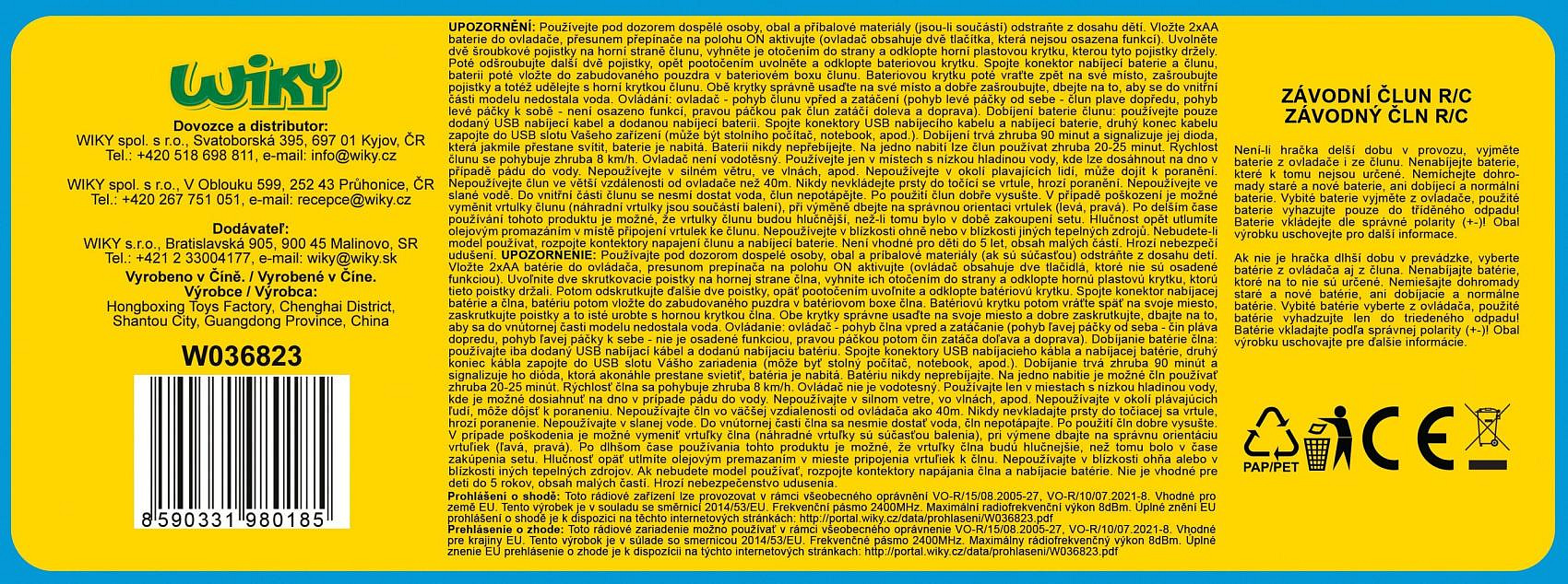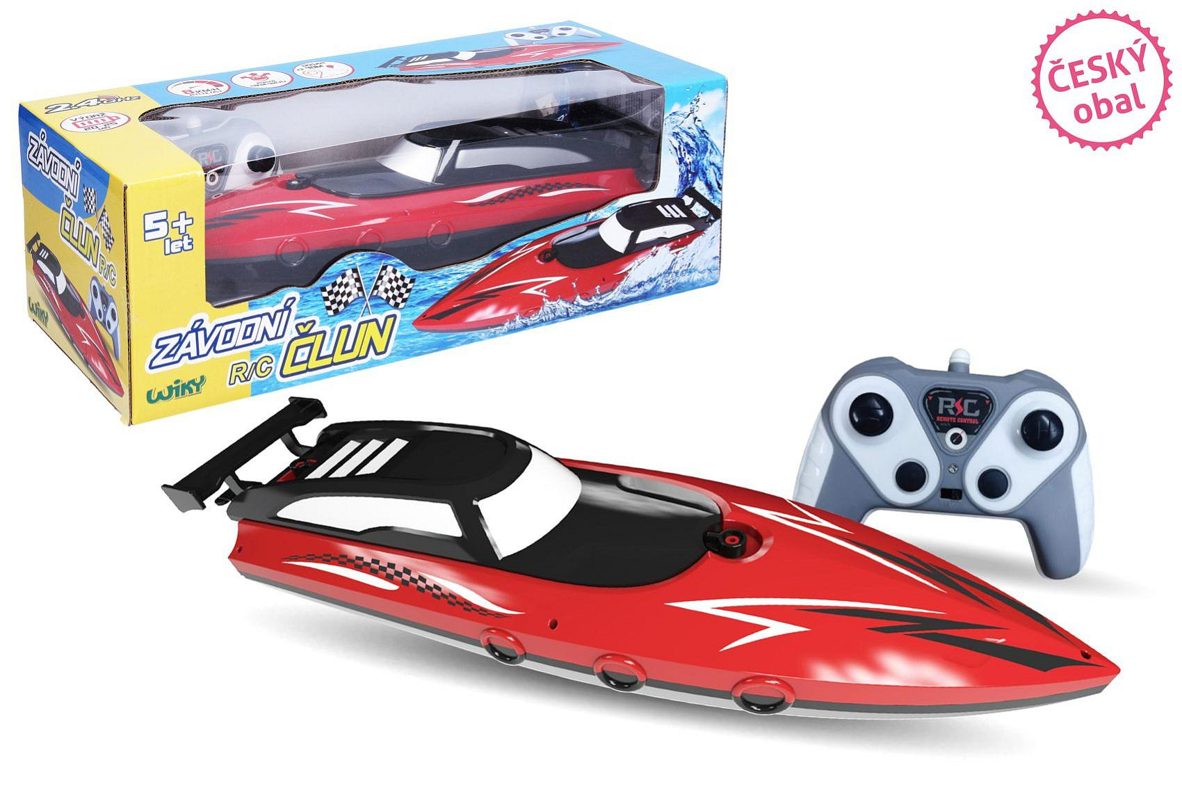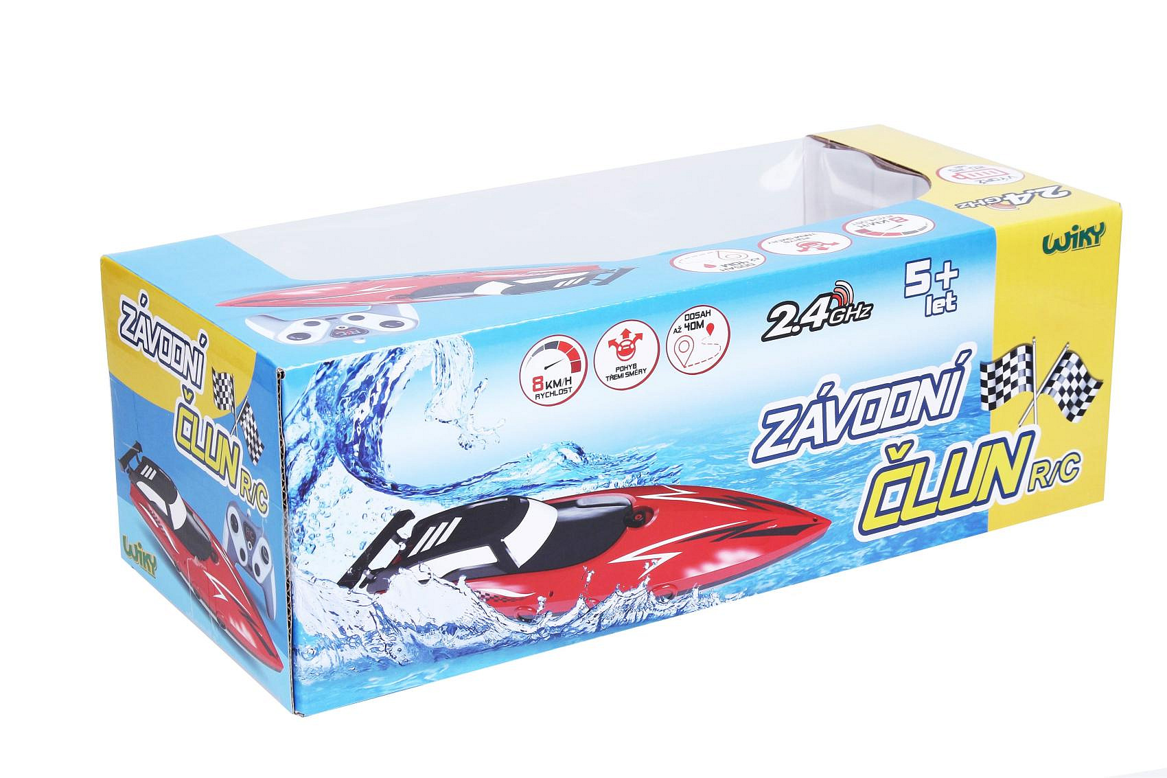Závodní člun RC na dálkové ovládání - český obal. Rozměry 33x9,5x8 cm. Frekvence 2.4 GHz. 3.7V 500mAh bateriový pack do člunu součástí, 2xAA baterie do ovladače nejsou součástí. USB kabel součástí. Přepínač ON/OFF na ovladači.