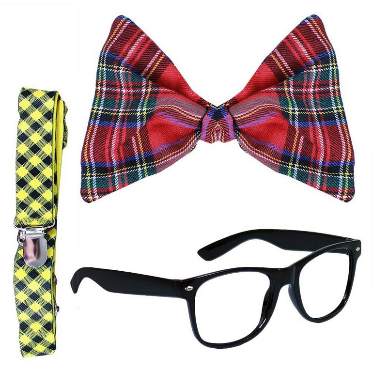 Originální sada pro všechny elegány! Karnevalová sada obsahuje motýlka na šňůrku, brýle a kšandy. Velikost motýlka je cca 20 cm. Perfektní kousky na párty!