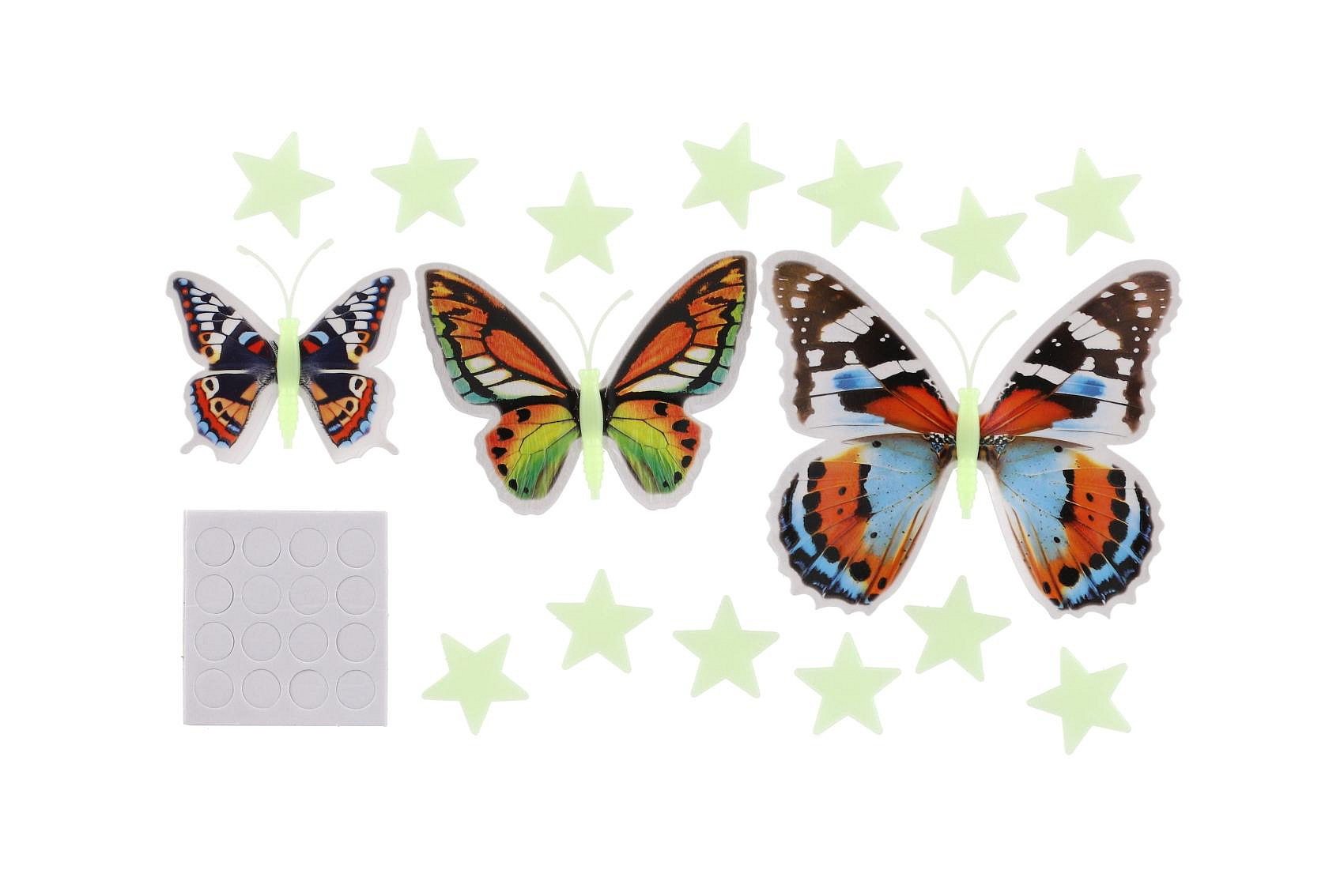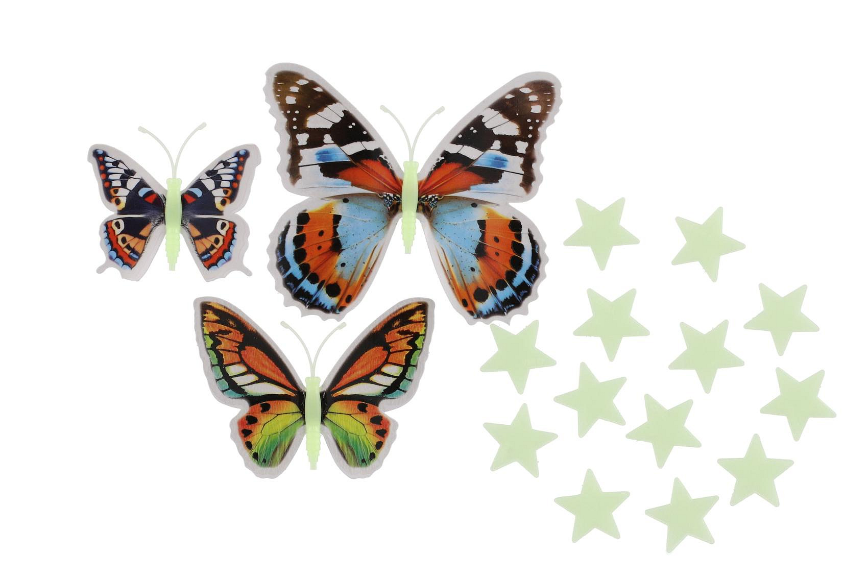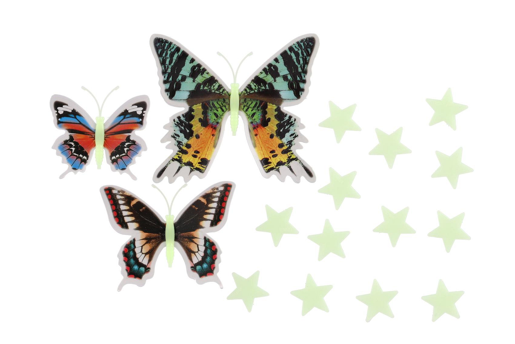 Kouzelná dekorace do dětského pokoje. Sada barevných motýlů a hvězdiček, které ve tmě svítí, vytvoří příjemnou noční atmosféru. Stačí je přes den „nabít“ světlem a večer rozzáří pokoj jemným světlem. Motýli lze snadno připevnit na zeď pomocí samolepicích bodů a vytvořit tak originální dekoraci podle vlastní fantazie.