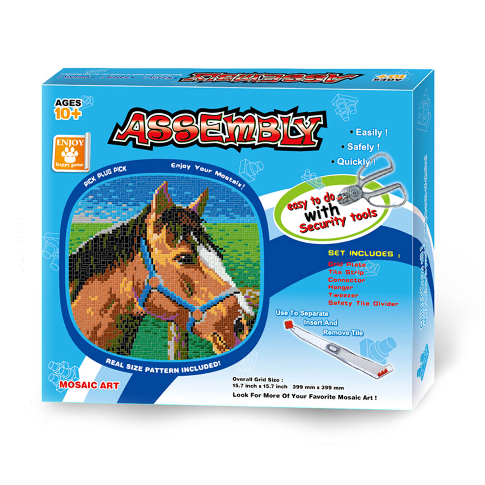 Tato velká mozaika s motivem koně, to jsou hodiny plné kreativity a zábavy. Obsahuje nástroje ke snadné manipulaci s jednotlivými dílky a jejich následné vkládání na speciální podložku, která má rozměry 39,9 x 39,9 cm. Rozvíjí kreativitu a jemnou motoriku u dětí.