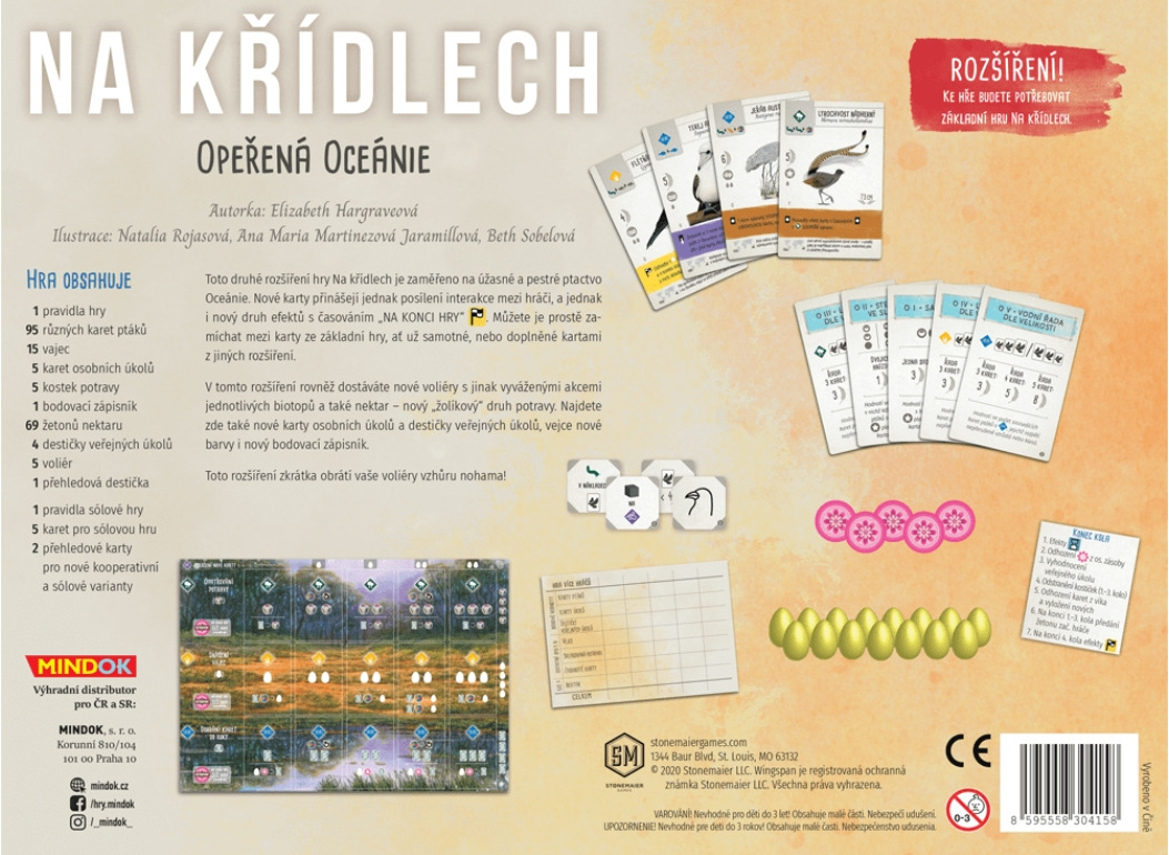 95 různých karet ptáků, 15 vajec, 5 karet osobních úkolů, 5 kostek potravy, bodovací zápisník, 69 žetonů nektaru, 4 destičky veřejných úkolů, 5 voliér, 1 přehledová destička, pravidla sólové hry, 5 karet pro sólovou hru, 2 přehledové karty pro nové kooperativní a sólové varianty