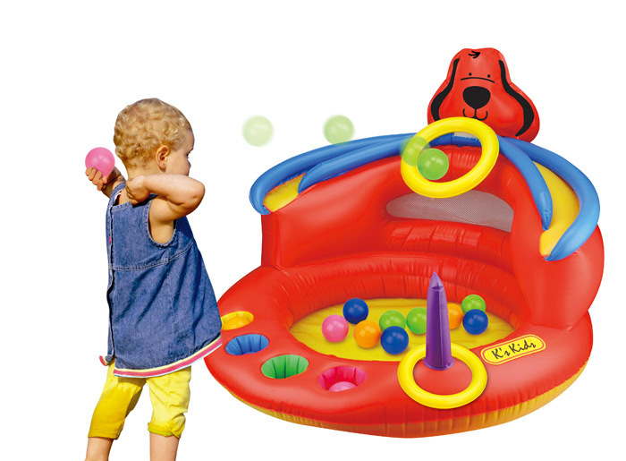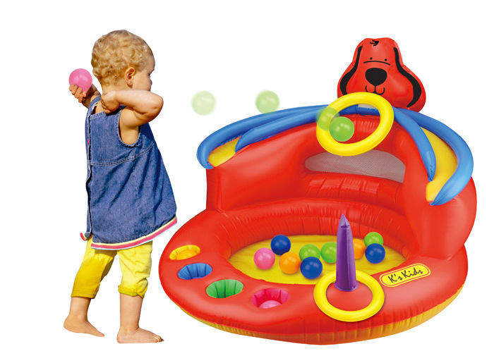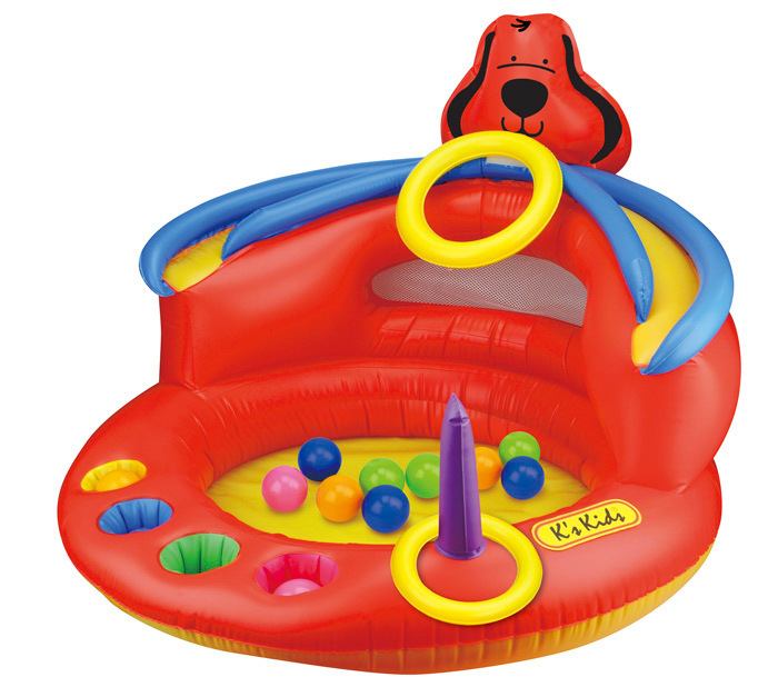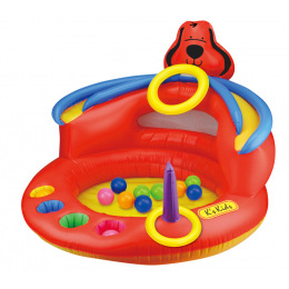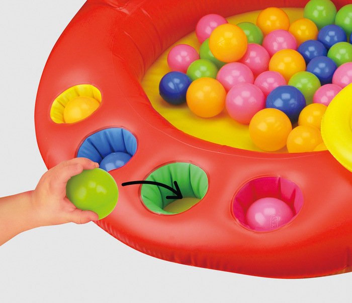 Děti milují míčky! S nafukovací arénou Patrik, která obsahuje 20 míčků, si děti užijí spoustu zábavy. Připevni žlutý kroužek pod nos pejska a zkus se do něj trefit míčky. Hoď nebo polož míček na žluto-modrou klouzačku a sleduj, jak se klouže dolů do arény. Poznávej barvy. Najdi správnou barvu míčku a vlož jej do barevného otvoru. Pro podporu koordinace oko-ruka je zde připraveno házení kroužků. Tato hračka není určena na vodu! Rozměry produktu: 93 x 60 x 93 cm. Rozměry balení: 37 x 49,8 x 12,3 cm. Věk: 12 m+