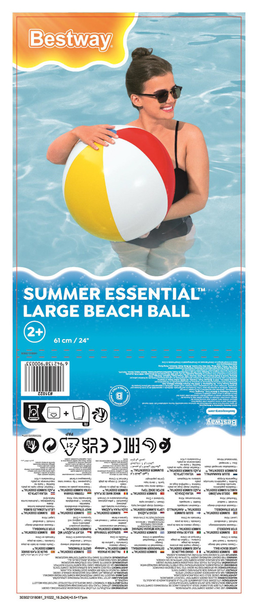 S nafukovacím míčem Bestway® Summer Essential se každý den u bazénu, nebo na pláži stane nezapomenutelným zážitkem. S průměrem 41 cm je tento plážový míč dokonalým doplňkem pro vodní radovánky, které potěší malé i velké. Vodní míč Summer Essential, ideální pro děti od 2 let, nabízí hodiny zábavy. Jeho klasický design dodává vodním radovánkám nadčasový nádech. Vyrobeno z kvalitního a odolného PVC. Používejte pouze pod dohledem dospělé osoby a ve vodě, kde dítě dosáhne na dno. Rozměry nafouknutého míče: Ø 41 cm. Rozměry nenafouknutého míče: 61 x 20 cm. Rozměry balení: 17,3 x 29,3 x 0,7 cm. Věk: 2+