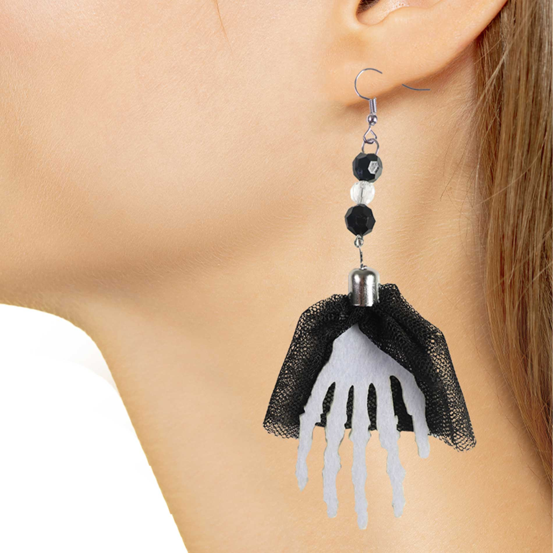 Exkluzivní karnevalové náušnice, které ti na Halloween párty nesmí chybět! Náušnice ruce kostry jsou zdobeny jemnými třpytkami. Senzace!