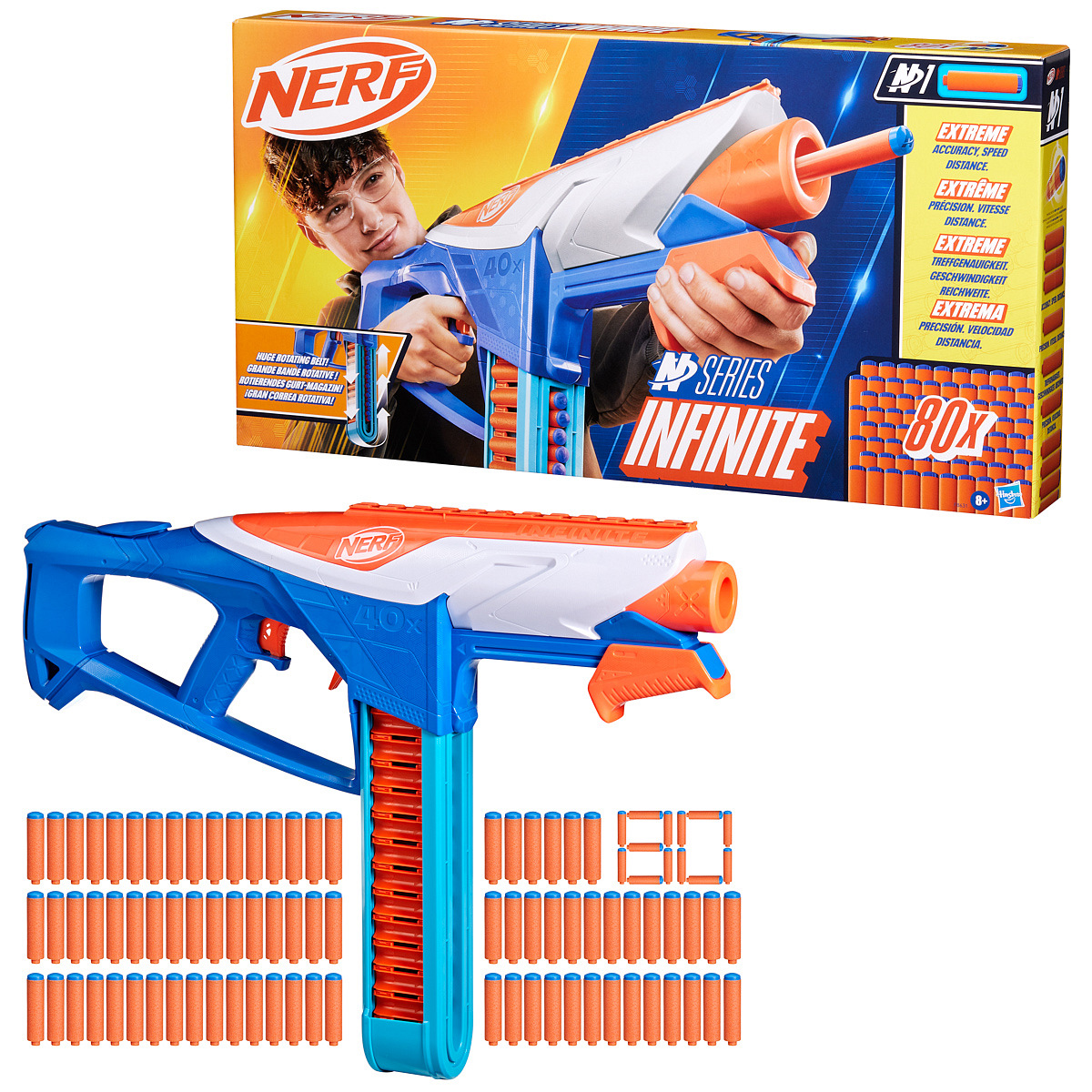 Pistole Nerf N Series Infinite od Hasbro, se kterou jen tak nějaká hra neomrzí. Blastr s vysokou kapacitou. Inovativní design bojového pásu pro snadné a rychlé nabíjení - pás pojme 40 šipek. Možnost rychlého výstřelu několika šipek za sebou nebo pomocí mechanismu pump action. Obsahuje 80 šipek. Hra s Nerf podporuje spolupráci, rychlé rozhodování a přesnou mušku. Hra s pistolí zajistí neopakovatelnou atmosféru a pořádnou dávku zábavy. Vyrobeno z kvalitního plastu. Při hraní je doporučeno, aby děti použily bezpečnostní brýle (nejsou součástí). Rozměr balení: 34,29 x 66,04 x 8,09 cm. Vhodné od 8 let.