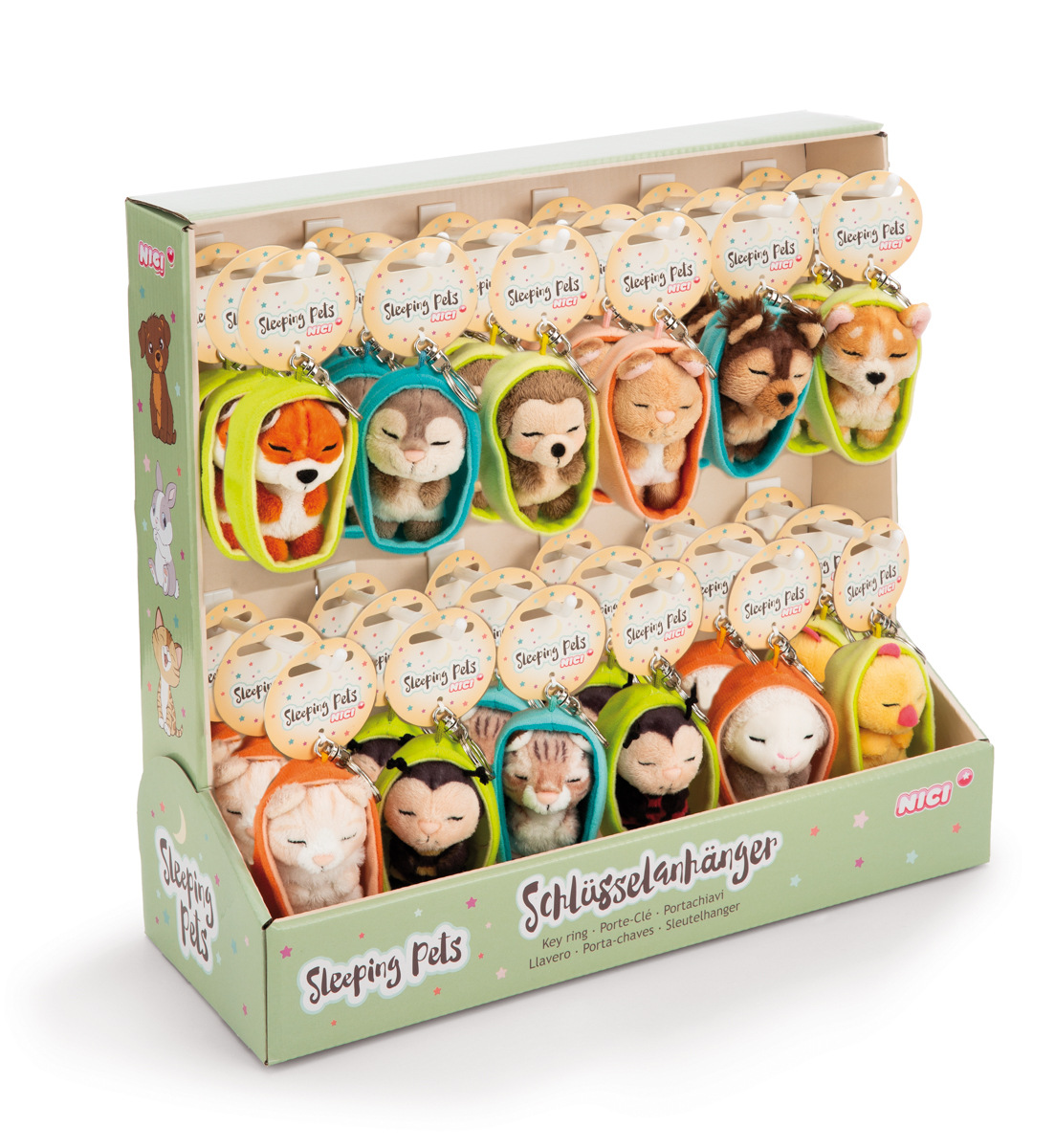 CDU NICI Pultový display – Spící zvířátka – klíčenky, plný. Klíčenky o velikosti 12 cm, vyrobené z hebkého plyše NICI. Speciální edice klíčenek Sleeping Pets představuje rozkošná zvířátka spící v plyšovém košíku. Plyšovou klíčenku lze pomocí pevného kovového kroužku připevnit na klíče, batoh, školní tašku nebo peněženku. Klíčenka je součástí světa produktů NICI GREEN. Pro produkty NICI GREEN se používá téměř výhradně plyš a výplňový materiál vyrobený z recyklovaných materiálů. Pro tento účel se na RPET zpracovávají primárně recyklované PET lahve. Tento CDU obsahuje 36 ks/12 druhů zvířátek. Assort je náhodný mix modelů. Výběr nelze ovlivnit. Varianty, které může assort obsahovat: liška, vydra, ježek, zajíček, jorkširský teriér, velšský Corgi, béžová kočička, hnědá kočička, beruška, včelka, jehně, kuře. Rozměry klíčenky cca: 12,5 x 5 x 5 cm. Rozměry CDU:. Věk: 3+