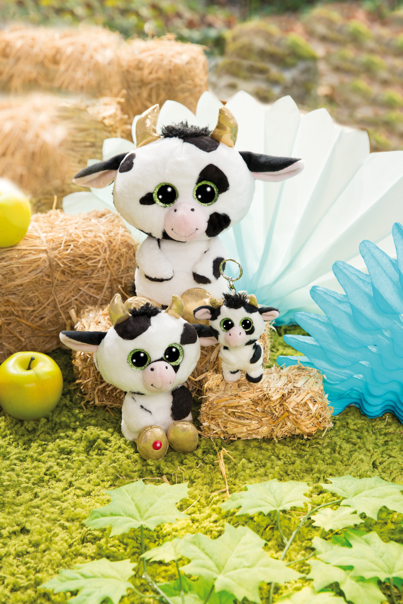 Černobíle tečkovaná a se zlatými třpytivými růžky - to je kravička GLUBSCHIS Moolon. Třpytivá zlatá kopýtka a nos jí dodávají okouzlující vzhled. S kroužkem na hlavě jako klíčenka. Výška: 9cm Věk: 3+