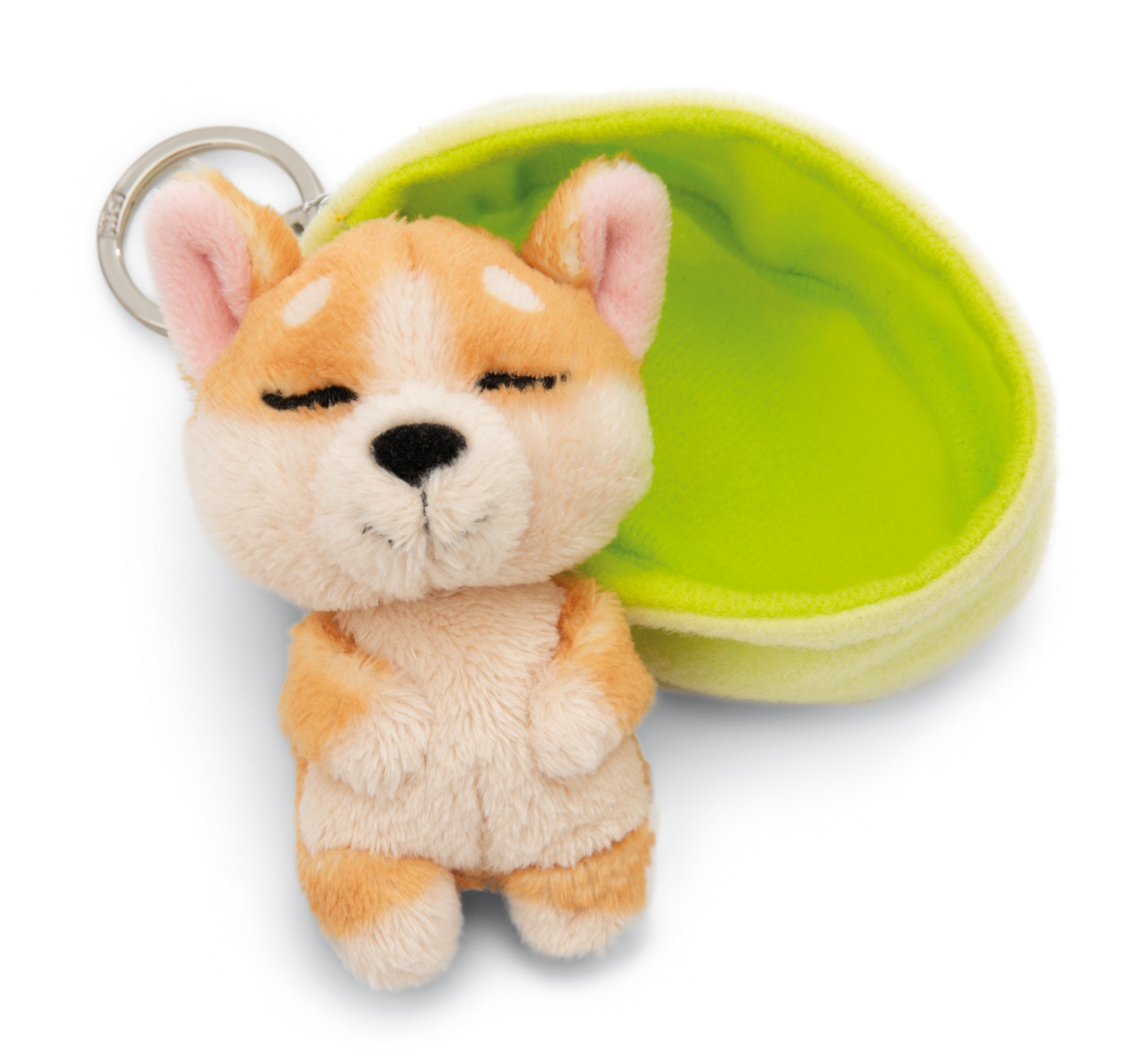 NICI klíčenka spící Pejsek Welsh Corgi 12 cm, světle zelený košík, GREEN