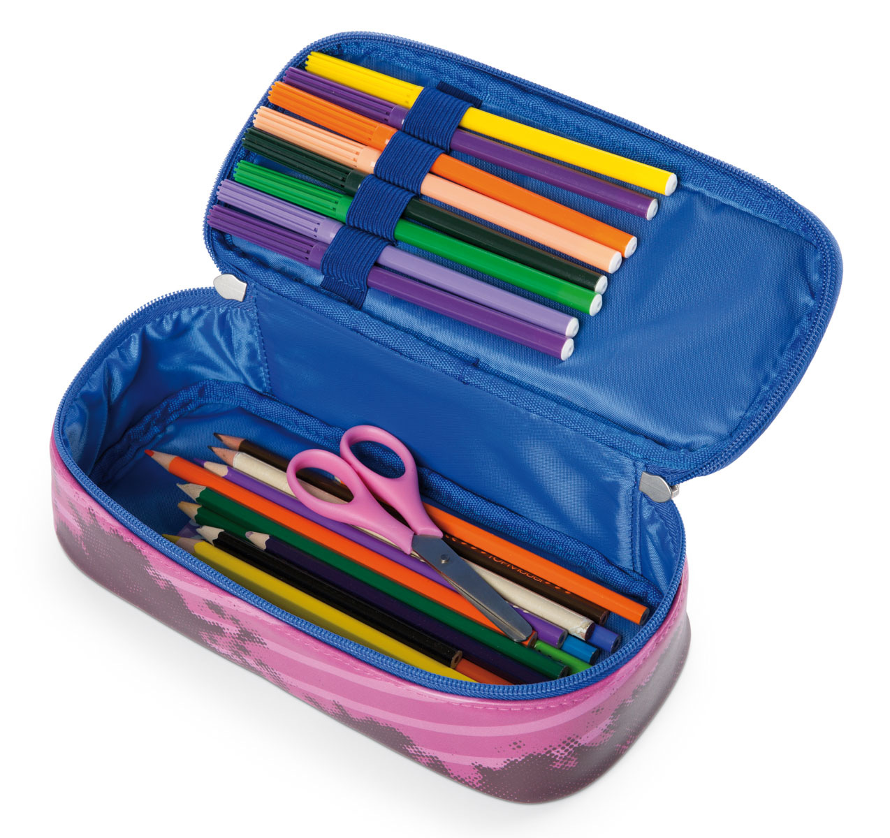 Prostorný penál vyrobený z polyesteru v kombinaci se silikonem ocení spíše starší školáci. Uvnitř pouzdra je kapsička uzavíratelná na zip a klopa se dvanácti klasickými gumovými úchyty na tužky a propisky, které je potřeba mít přehledně uspořádané a po ruce. Prostor pod klopou pak umožňuje volně umístit další psací potřeby – pastelky, fixy, prostě vše důležité. Polstrování spolehlivě chrání obsah penálu při nárazech a pádech. Zapínání je na zip s velkým taháčkem, který umožňuje dětem snadné otvírání a zavírání penálu. Na přední straně je umístěn unikátní silikonový PIXIE CREW creative panel TM černé barvy. K dispozici máte 83 bodů pro nekonečné množství motivů na každý den díky PIXIES (pixelům), které můžete kdykoli sundat a vyměnit za jiné. Ke každému penálu zdarma přikládáme balíček přibližně 50ks malých PIXIES (pixelů) pro inspiraci.