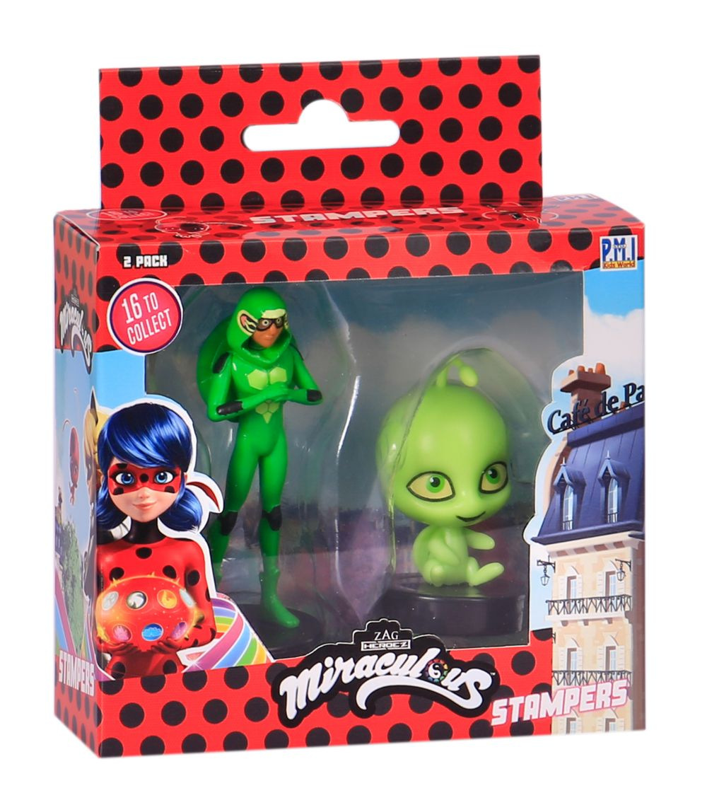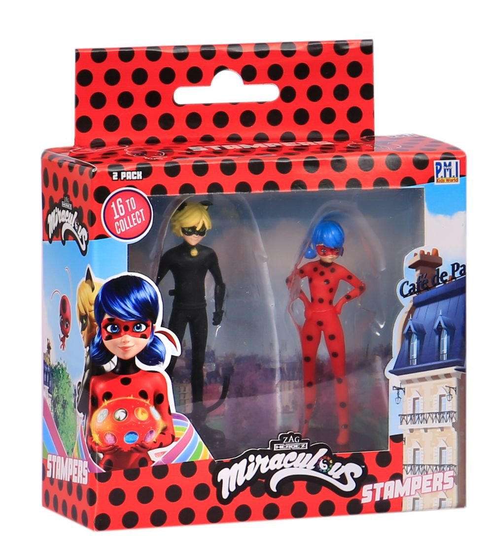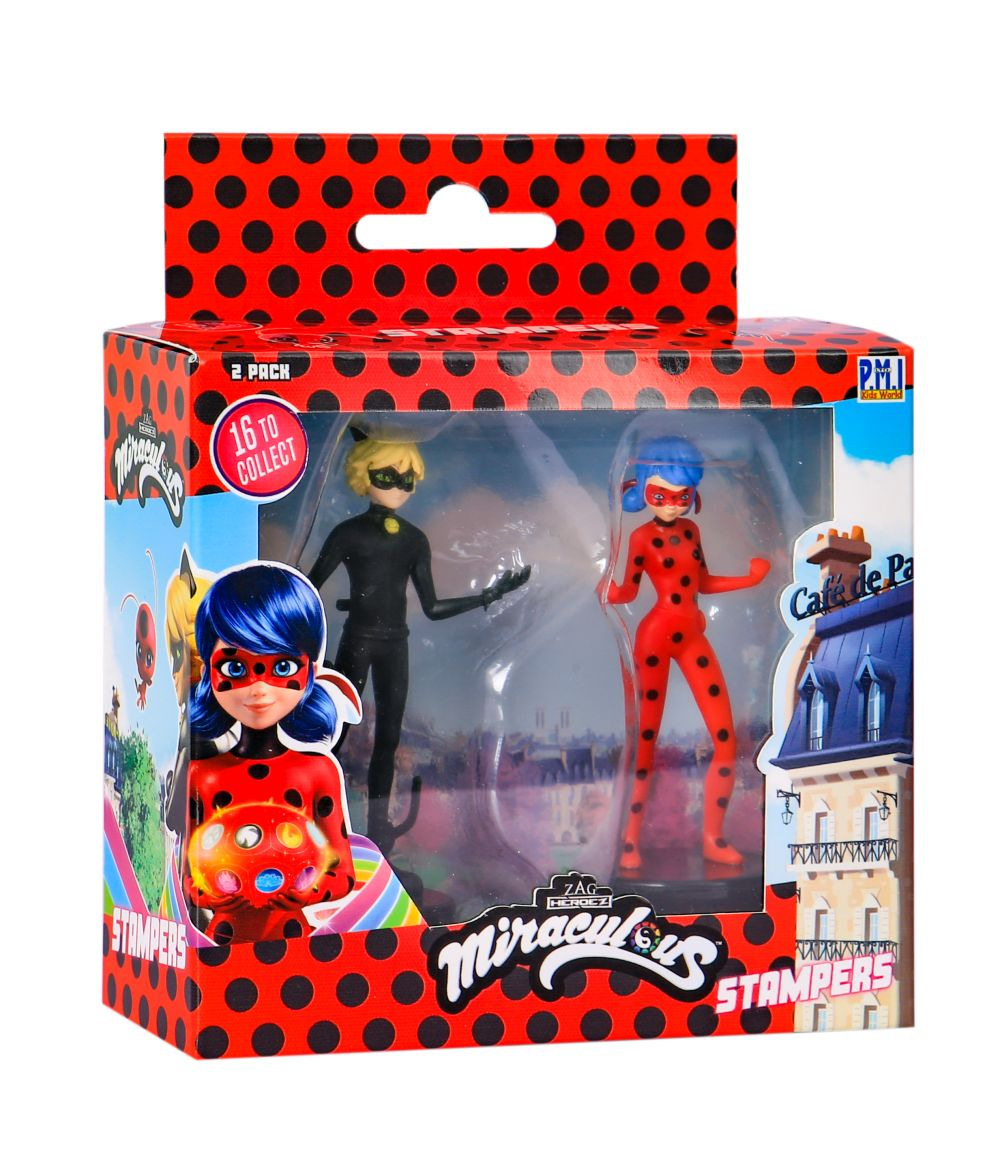 Dvě kouzelné figurky z pohádky Miraculous: Beruška a černý kocour s razítky. Tyto figurky mají ve spodní části razítka, takže děti si mohou ozdobit školní práce, vytvořit nové obrázky a další. Vhodné pro děti od 3 let.
