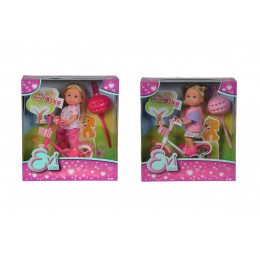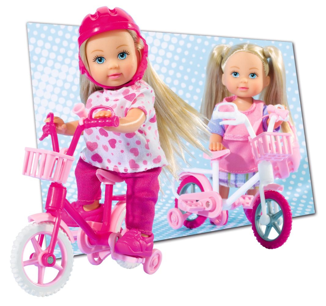 Panenka Evička na jízdním kole s balančními kolečky. Nechybí cyklistická helma ani láhev. Výška panenky 12 cm.