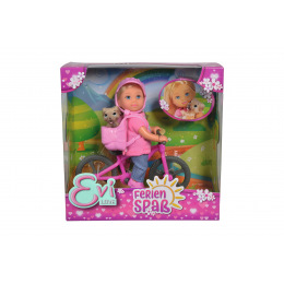 Panenka Evička v cyklistické helmě s jízdním kolem a s jejím pejskem sedícím v batohu. Výška panenky 12 cm.