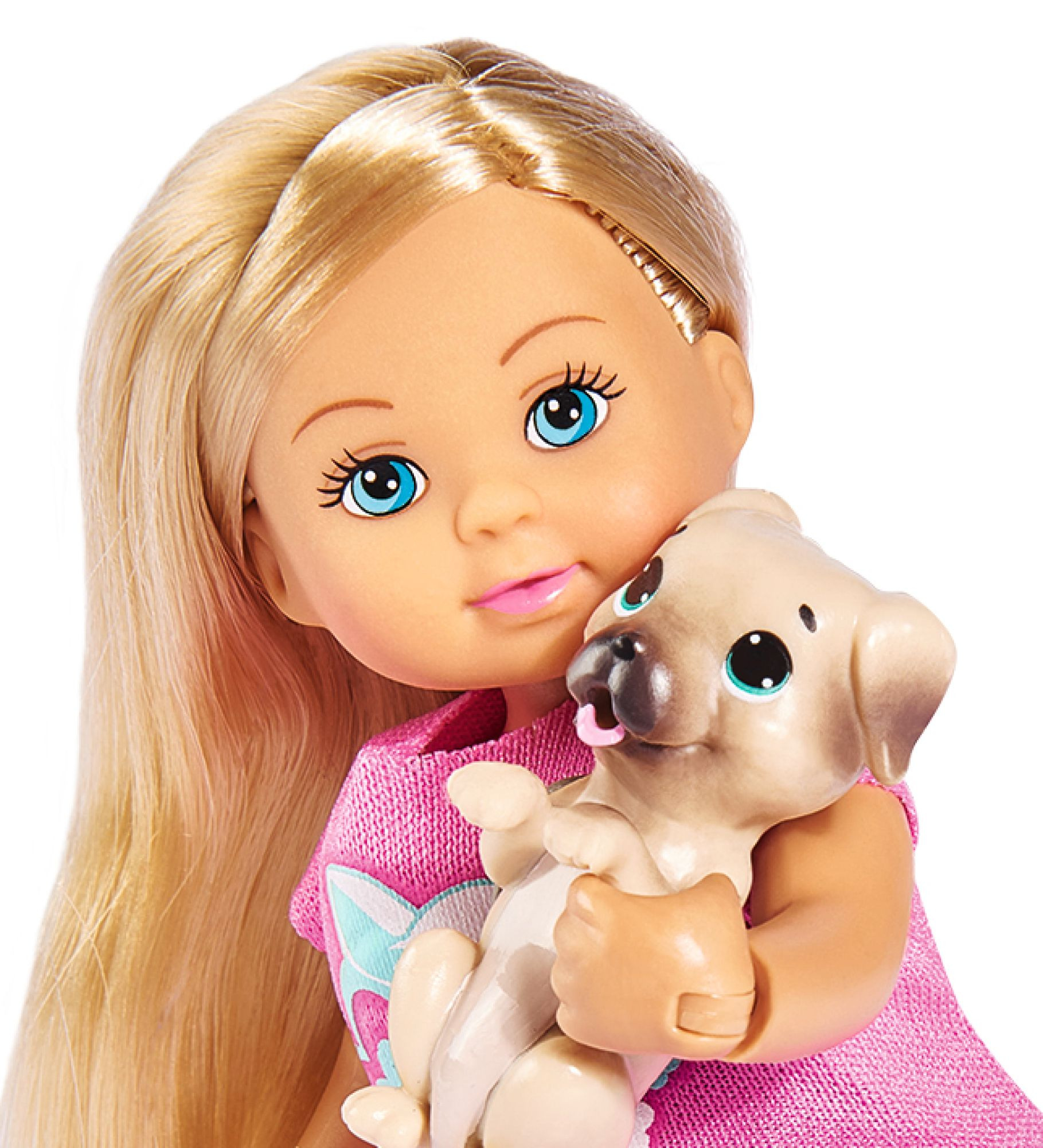 Panenka Evička s domácím mazlíčkem. Obsahuje 4 zvířátka a doplňky. S pejsky nebo s kočičkami. Výška panenky 12 cm.