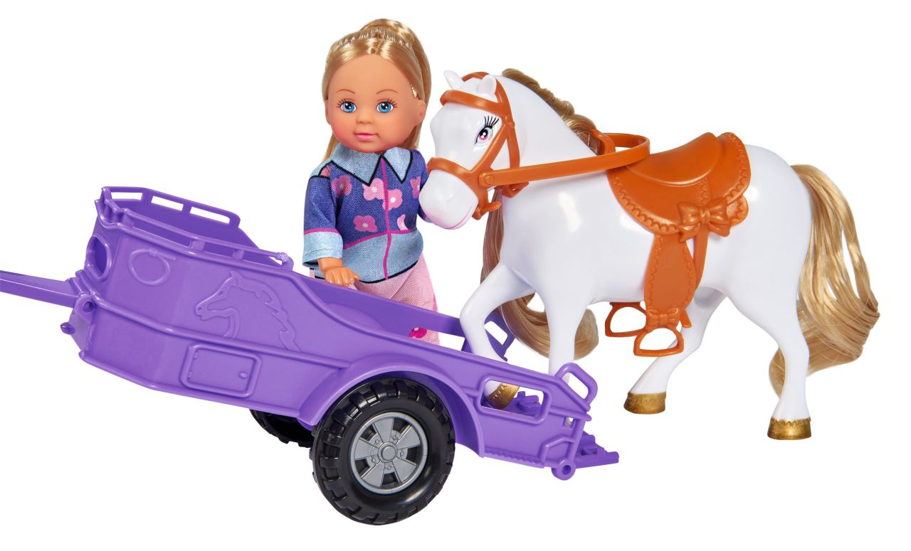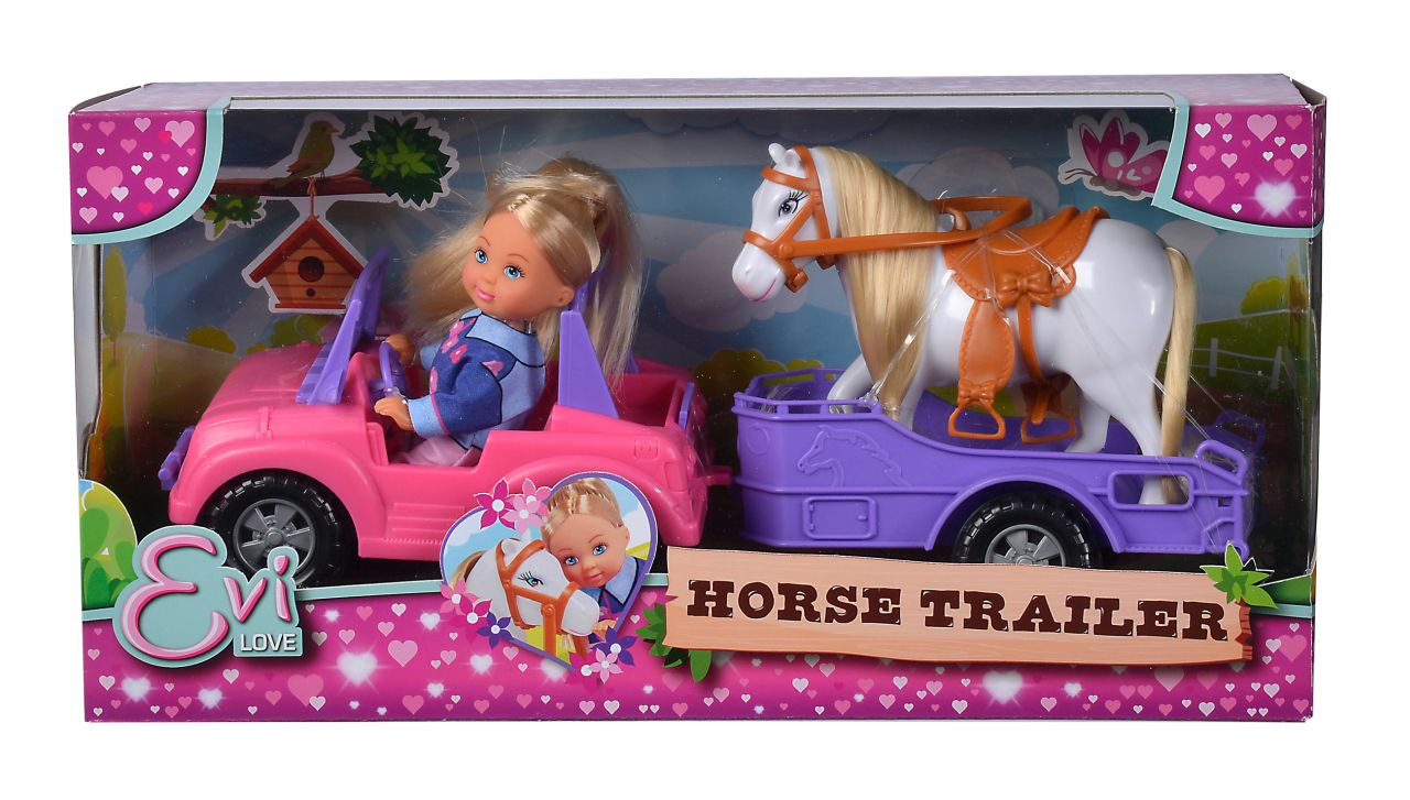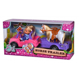Panenka Evička má džíp a také přívěs pro koně. Nechybí ani poník. Délka auta s přívěsem 33 cm. Výška panenky 12 cm.