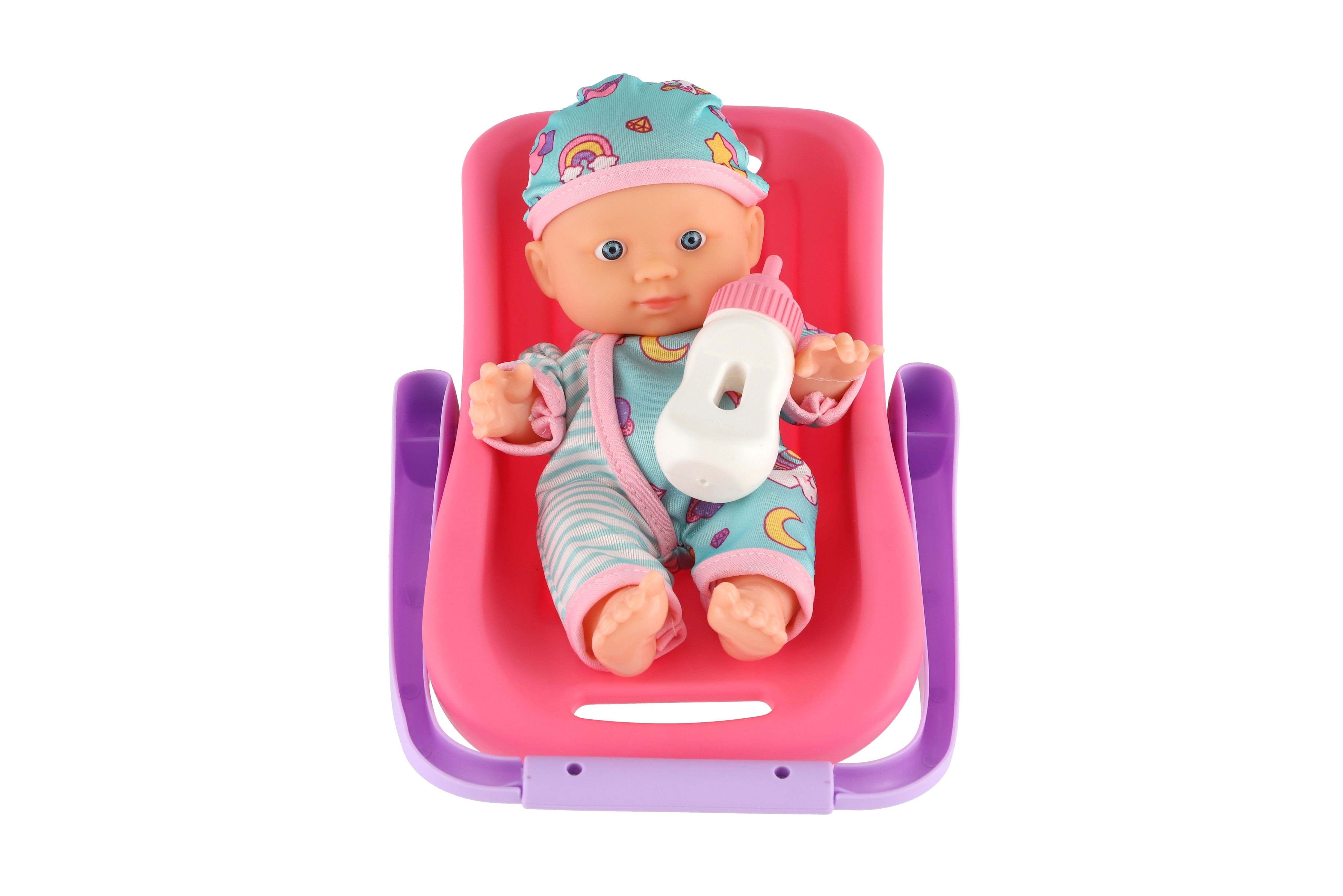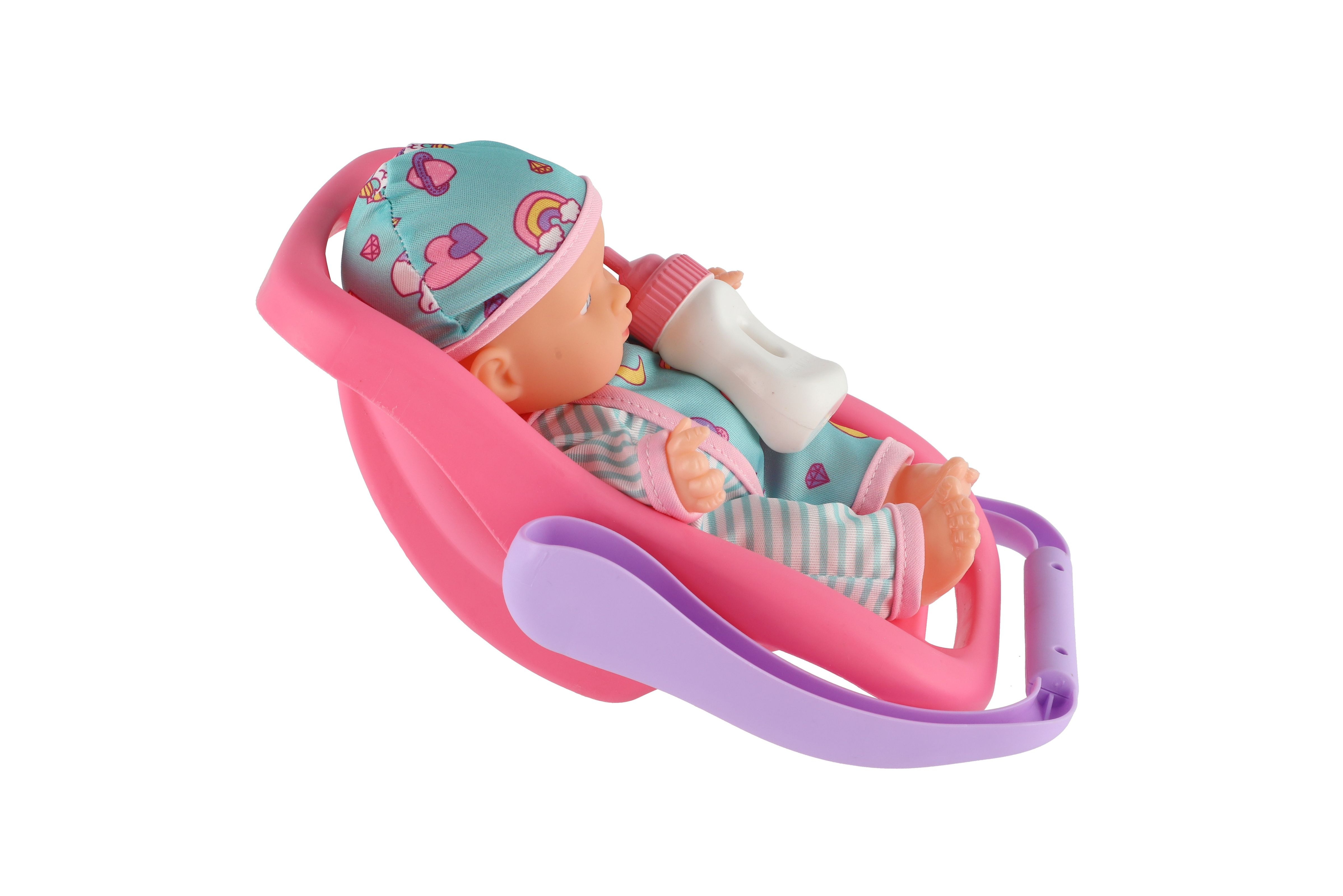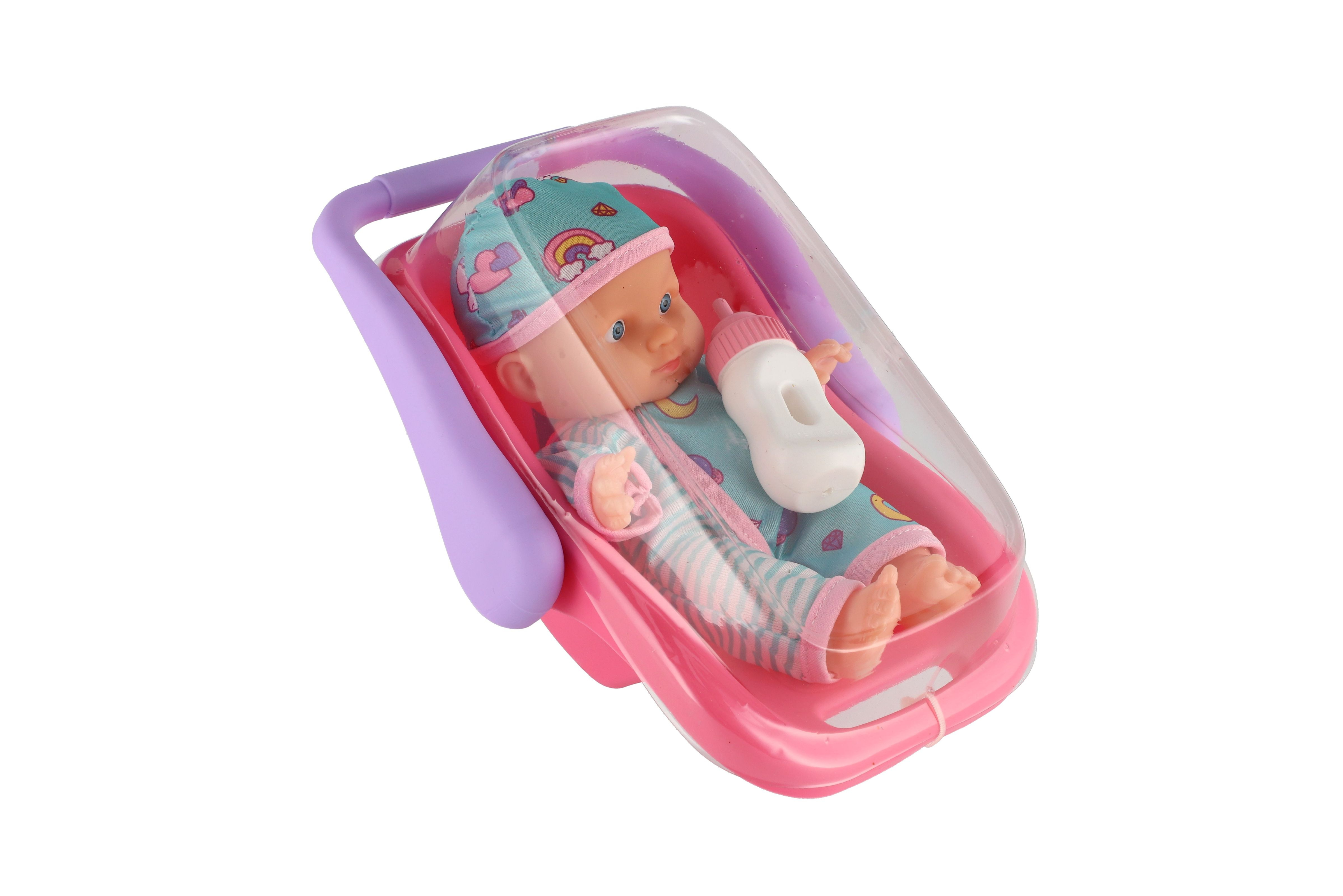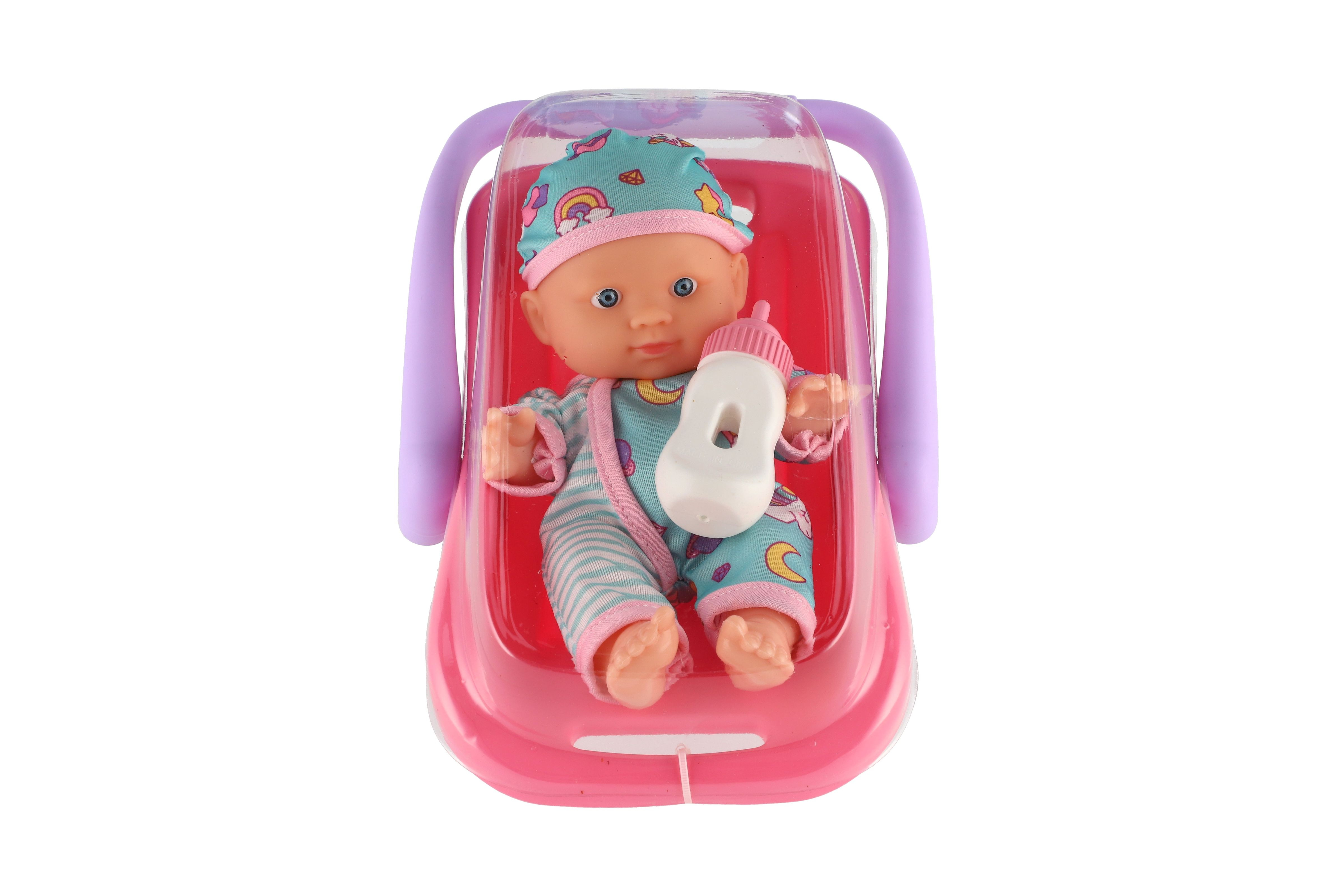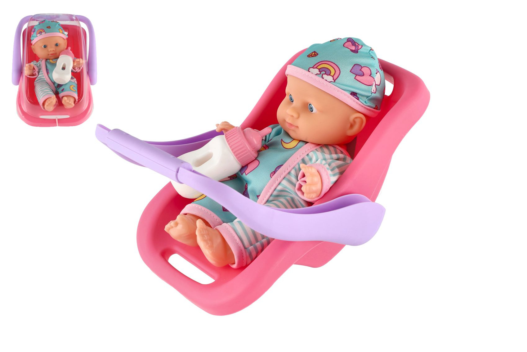 Popis Panenka miminko 20 cm plast v nosítku/autosedačce s lahvičkou v blistru