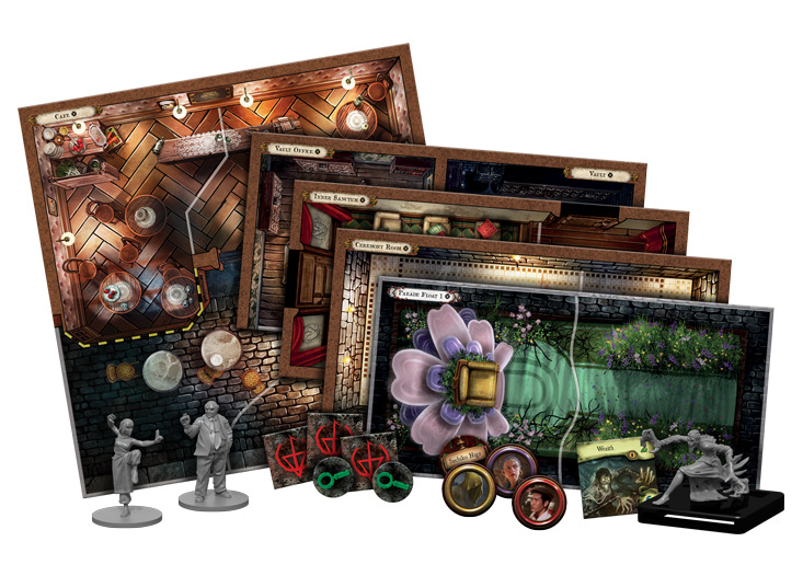 6 karet unikátních předmětů, 10 karet kouzel, 7 karet podmínek, 2 karty zranění, 2 karty strachu, 20 žetonů zadržení, 10 žetonů osob,