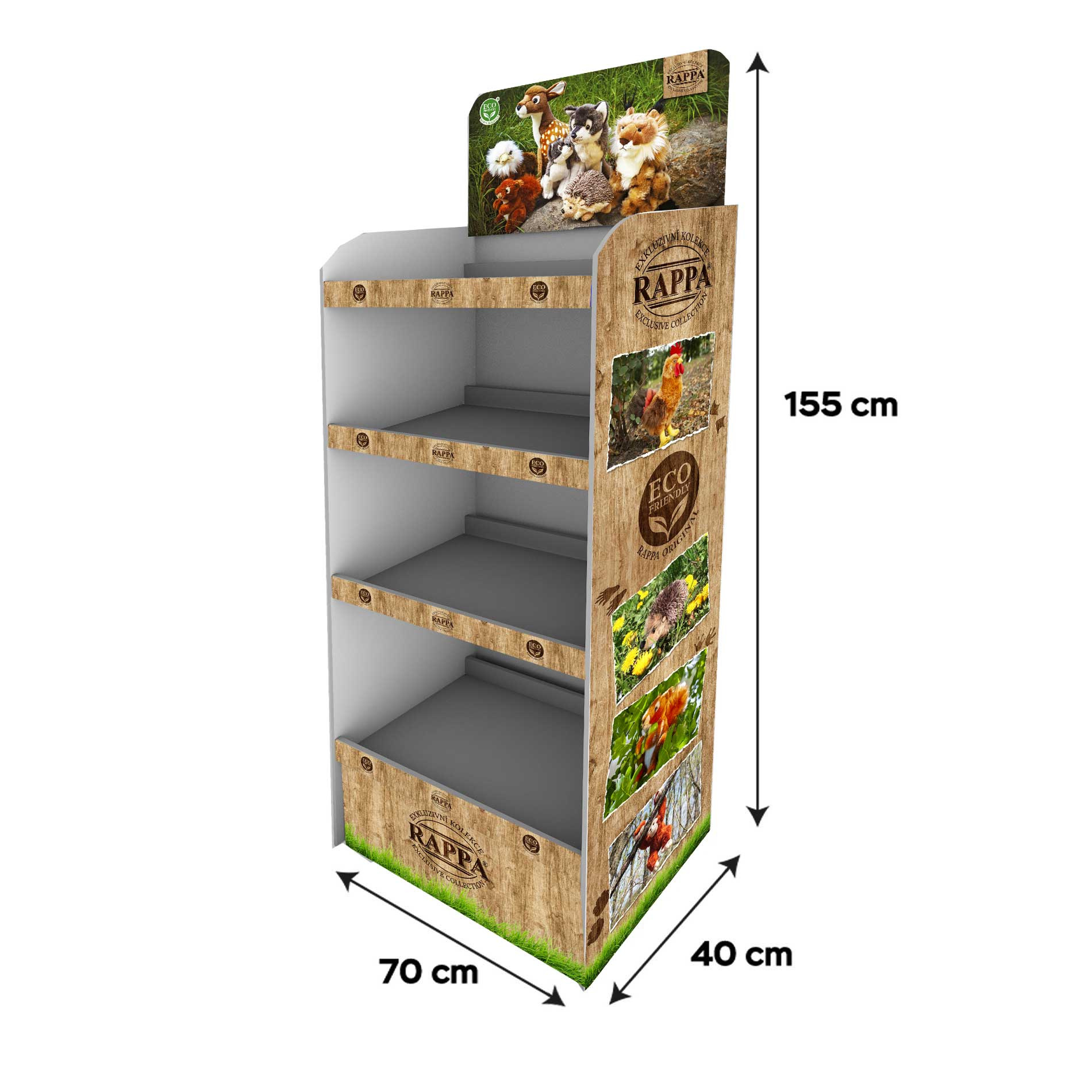 Prezentace výrobků je důležitá, proto je u nás k dispozici tento papírový stojan v designu Exkluzivní plyše. Rádi byste si tento stojan umístili k Vám na prodejnu? Stojan je k dispozici k propůjčení ZDARMA v případě objednávky Exkluzivní plyše v minimální hodnotě 20 000 Kč bez DPH. Kontaktujte svého obchodního zástupce anebo centrálu společnosti pro více informací.