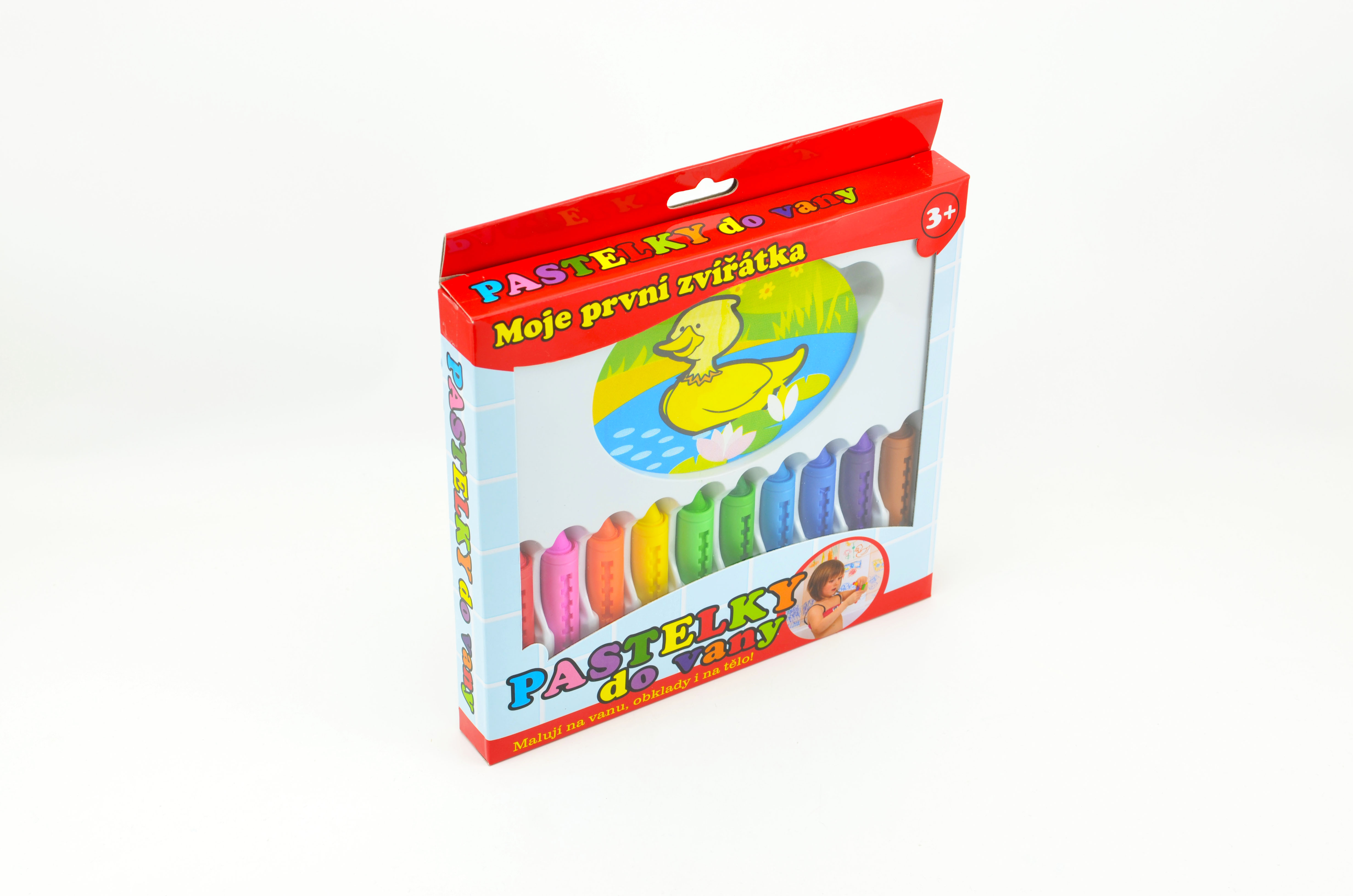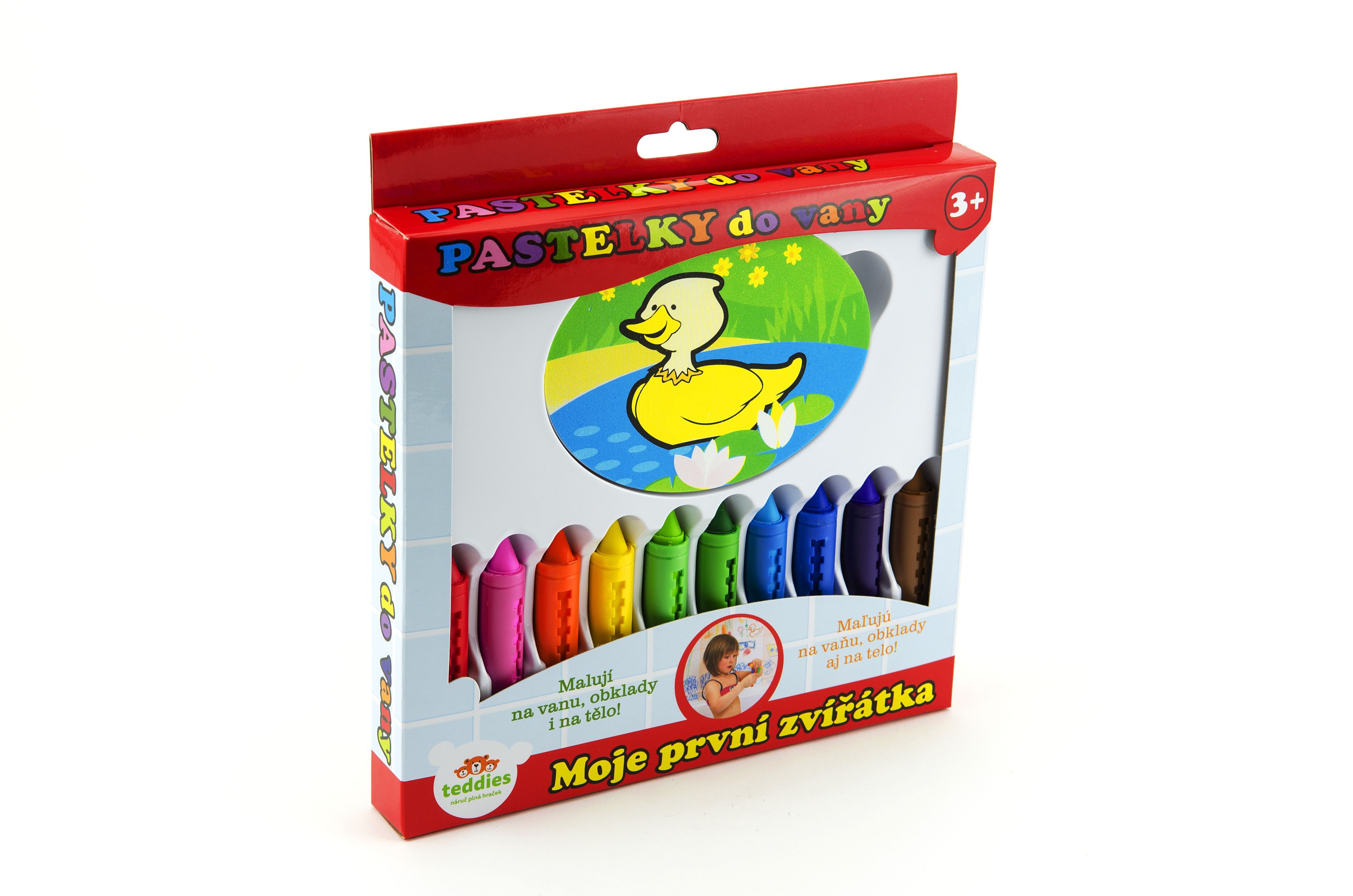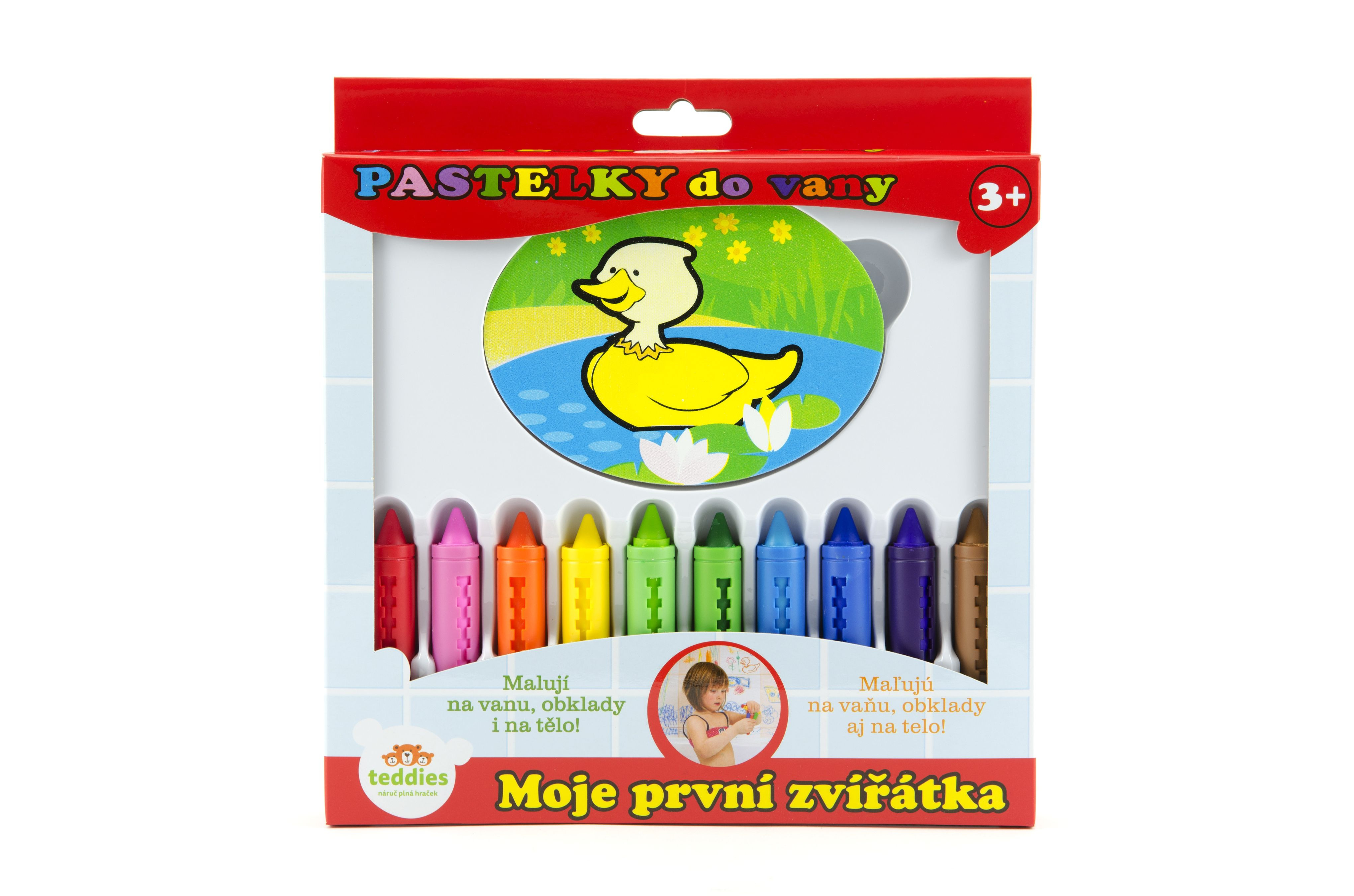 S pastelkami do vany Moje první zvířátka se vaše koupelna promění každý den v jiný svět. Malují na vanu i obklady a děti si s nimi užijí moře legrace. Mohou vytvořit hotová umělecká díla a maminky se nemusí obávat, protože tyto pastelky jdou lehce smýt. Jsou zcela bezpečné, netoxické a hypoalergenní. Sada obsahuje 10 pastelek a houbičku s motivem kačenky Rozměr krabičky: 21 x 22 x 3 cm Vhodné od 3 let.