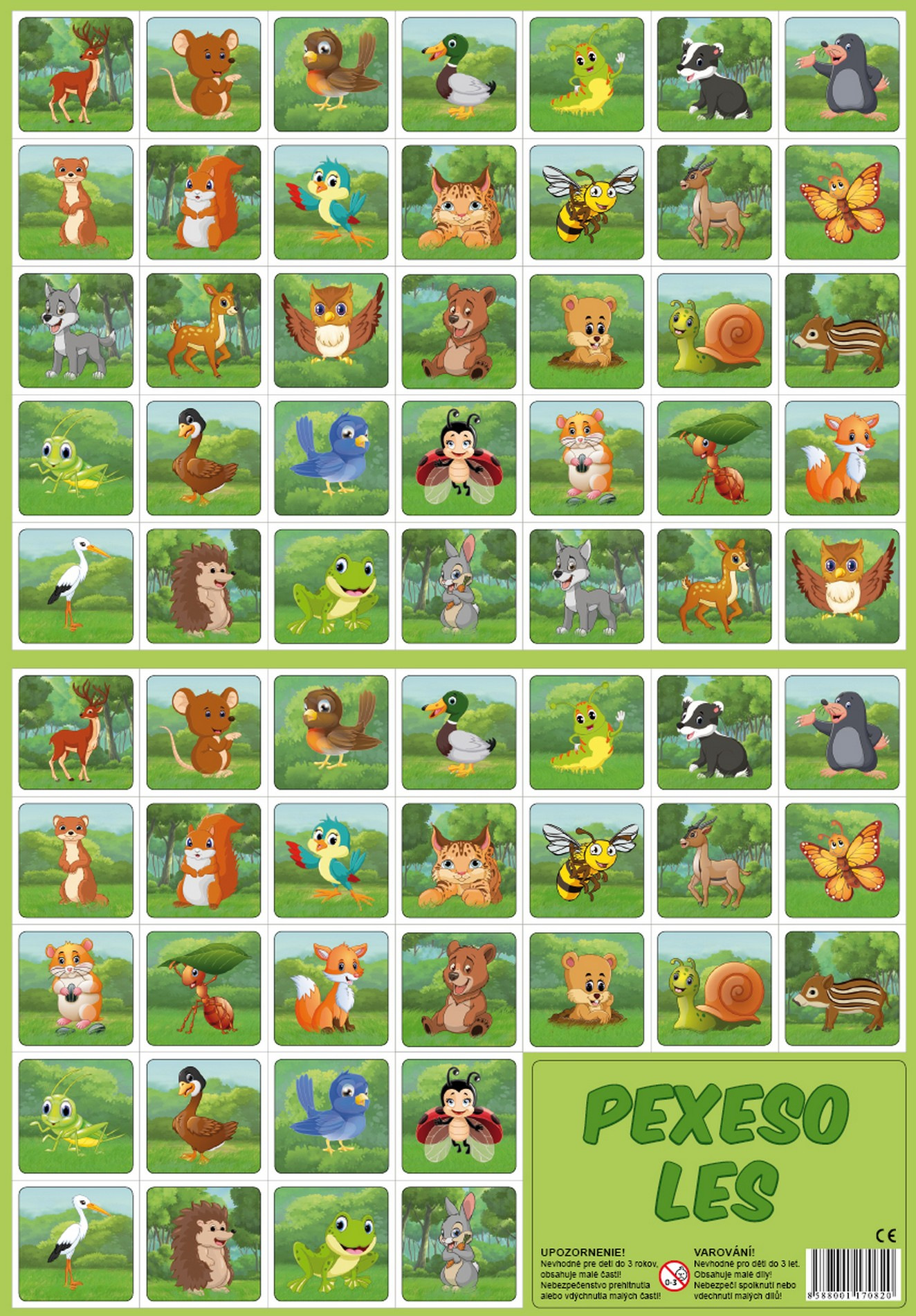 Společenská hra, při které si děti hravou formou trénují svou paměť. Hra se po rozstříhání skládá z 32 obrázkových dvojic. Pexeso 32 dvojic s obrázky kreslených zvířátek z lesa.