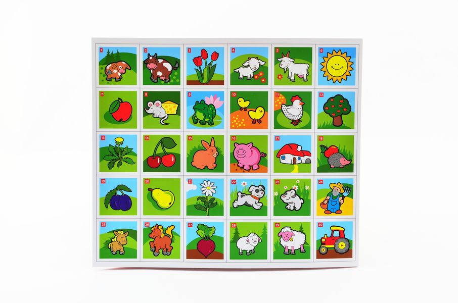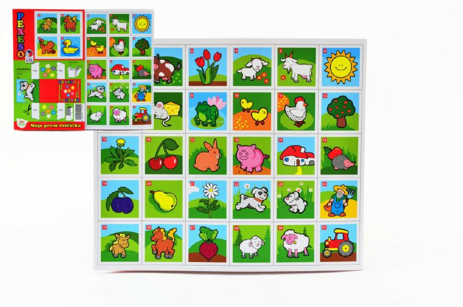 Papírové pexeso obsahuje 32 dvojic s veselými obrázky. Děti si mohou sestavit i krabičku, do které si všechny kartičky mohou uklidit.