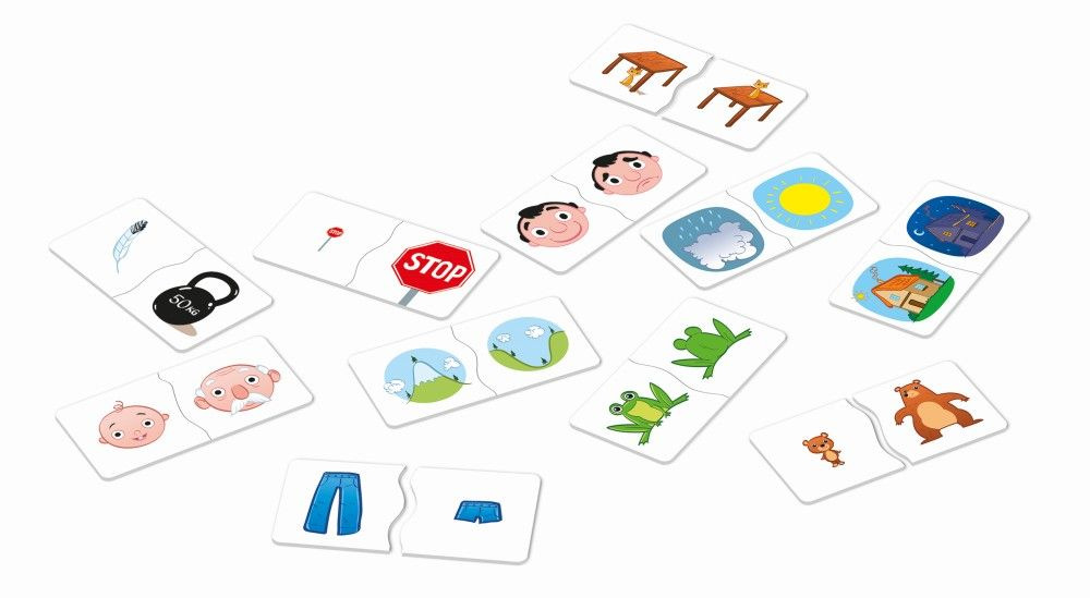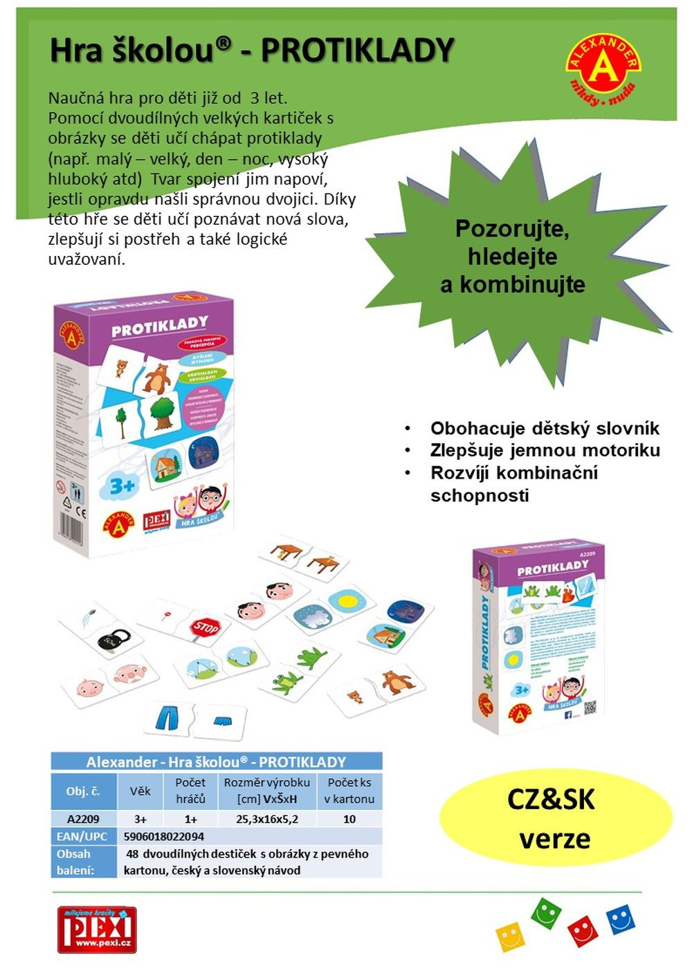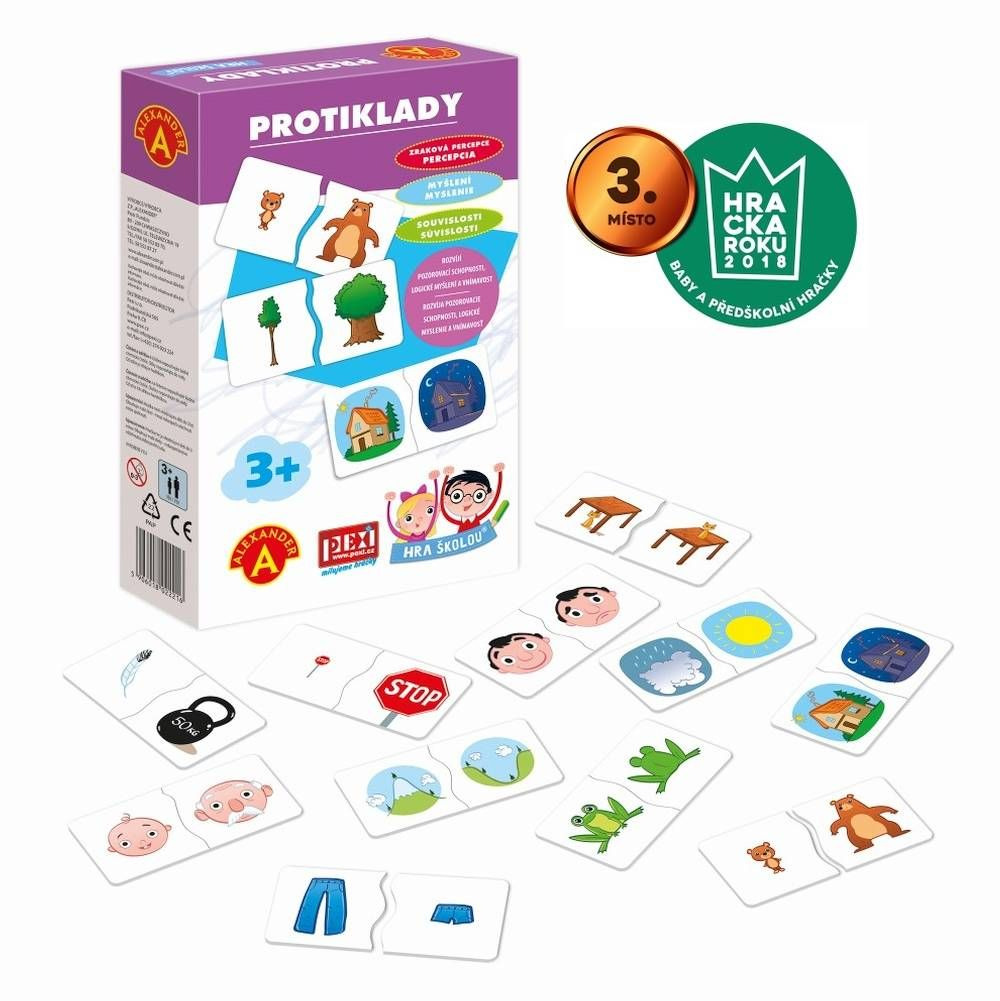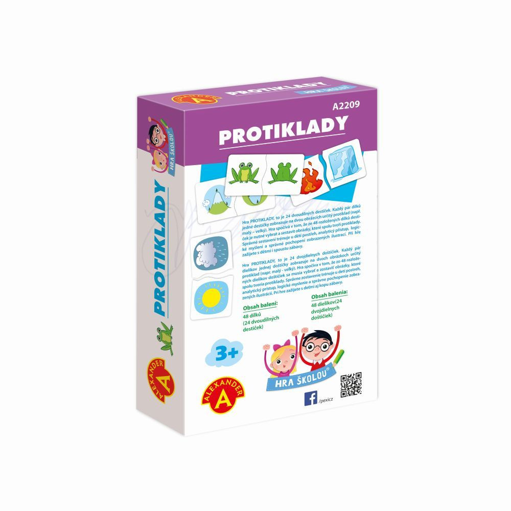 Naučné hraní pro malé objevitele . Krabička "HRA ŠKOLOU® – PROTIKLADY pro děti již od 3 let do 6 let.\nPomocí dvoudílných velkých kartiček s obrázky se děti učí chápat protiklady (např. malý – velký, den – noc, vysoký hluboký atd) Tvar spojení jim napoví, jestli opravdu našli správnou dvojici.\n\nTéměř každé dítě má rádo krásné obrázky a proto je učení snadné a zábavné. \nHolčičky a kluci, budou hledat a spojovat dva dílky patřící k sobě do jedné destičky. Všechny dílky rozloží a promíchají. Potom hledají správnou dvojici. Pozorujte, hledejte a kombinujte. Podaří se nakonec najít a opět dát dohromadyvšechny protiklady? \nDíky této hře se děti učí poznávat nová slova, zlepšují si postřeh a také logické uvažovaní.\n\nPokud si děti nebudou jistí, jestli k sobě daná dvojice patří, poznají to hned po přiložení obou polovin destičky k sobě, podle tvaru vlnky, která do sebe perfektně zapadne.\n\nBENEFITY: \n- pomáhá s rozvojem vyjadřování a obohacuje dětský slovník\n- přirozeně rozvíjí pozorovací a kombinační schopnosti\n- pomáhá zlepšovat jemnou motoriku \n\nHra je vhodná pro děti od 3 do 5 let.\n\nObsah balení: 48 dvoudílných destiček s obrázky z pevného kartonu, český a slovenský návod ke hře
