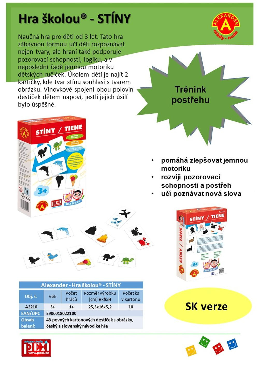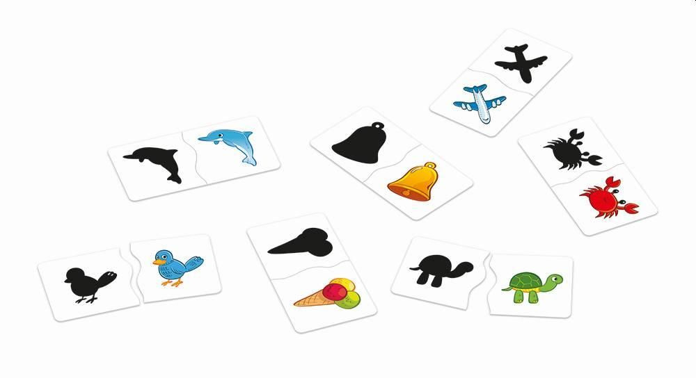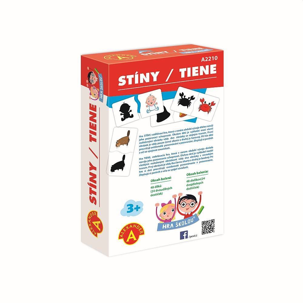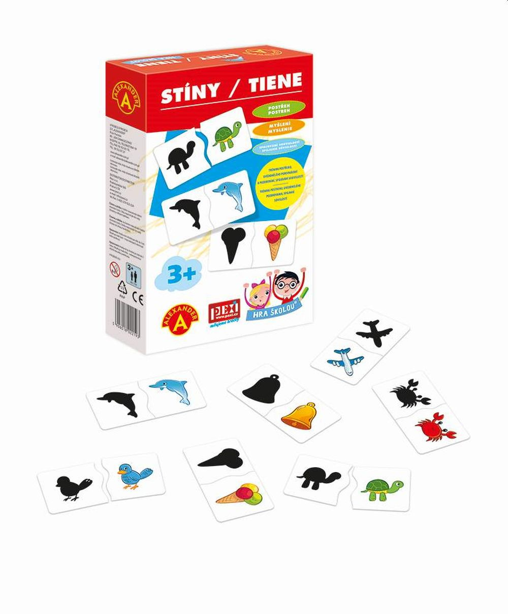 HRA ŠKOLOU® - STÍNY je naučné hraní pro malé objevitele od 3 let rozvíjí kombinační schopnosti, pozorování a postřeh. Sestav a poznej 24 dvojic složených ze stínu a barevného obrázku zvířat, hudebních nástrojů a věcí z každodenního života.\n\nPoznáš zvířátka nebo hudební nástroje jen podle obrysu? Sestav 24 párů jako puzzle a pokračuj ve hře. Oblíbená hra z edice Hra školou®. Zábava i pro maminky a tatínky. Jak vypadá obrys kachněte? V čem se liší od kuřátka? Váháte? Poznávejte svět společně. Kolik nápadů, tolik variant. Jak dítě poroste, stane se hra čím dál zábavnější. Pro nejmenší (od 3 let): Nechte dítě složit dvojice a prohlížet si obrázky.\n\nStřední obtížnost: Ukazujte si konkrétní zvířata, hudební nástroje a věci z obrázků a povídejte si o nich.\n\nZvídavé otázky pro chytré hlavičky: Ptejte se a společně zjišťujte třeba:\nKolik zvířátek najdeš mezi motivy? Která žijí v moři?\nKteré věci z obrázků máme doma?\nKolik vidíš hudebních nástrojů?\nCo jedí zvířátka z obrázků?\nSestav a poznej všech 24 motivů!\nZábavnou formou se tak děti učí rozpoznávat nejen tvary, ale hraní také podporuje pozorovací schopnosti, logiku, a v neposlední řadě jemnou motoriku dětských ručiček.\n\nBENEFITY:\n- Nekonečná zábava. Sestavte společně dvojice a povězte si o nich co nejvíc.\n- K hraní kdykoli a kdekoli. Vezměte kartičky s sebou na návštěvu i do čekárny. Stačí rozbalit a hrát.\n- Rozvoj kombinačních schopností, postřehu a pozorování. Hra stimuluje poznávací schopnosti dětí. Dvojice samostatně sestaví děti zhruba od 3 let věku.\n\nHra je vhodná pro děti od 3 do 5 let.\n\nZ RECENZE DESKOVÉ HRY.COM:\n....Stíny jsou krásnou dětskou hračkou, která se hodí každému, kdo vychovává nějakého mrňouse.\n\nObsah balení: 48 pevných kartonových destiček s obrázky, český a slovenský návod ke hře