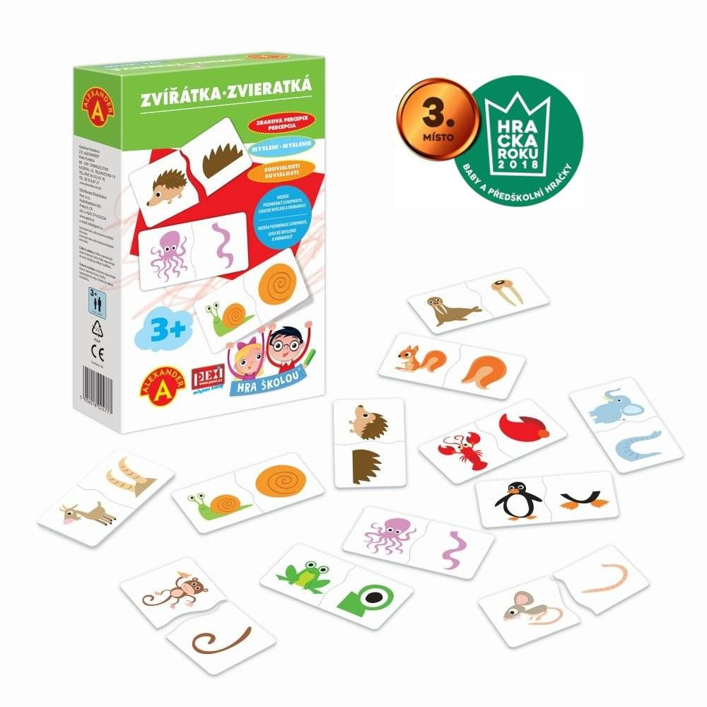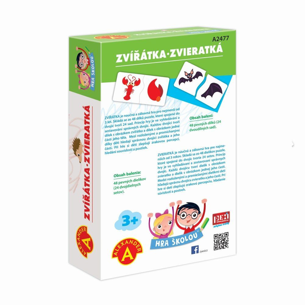 Hra školou® ZVÍŘÁTKA je naučné hraní pro malé zvědavce od 3 let do 5 let. Parádní pomůcka pro rozvoj postřehu, logiského myšlení a zrakové percepce.\n\n Skládá se ze 48 dílku s obrázky, které jsou spojené do dvojic a tvoří 24 sad. Princip hry je ve vyhledávání a sestavování správných dvojic. Každou dvojici tvoří dílek s obrázkem zvířátka a dílek s obrázkem jedné části jeho tela. Mezi rozloženými a promíchanými dílky děti hledají správnou dvojici zvířátka a jeho části.\n Při hře si děti zlepšují zrakovou percepci, hledání souvislostí a rozvíjí postřeh.\n\nHra obsahuje: 48 pevných dílků a barvenými obrázky, jejich tvarové spojení usnadňuje dětem ověření správné volby.
