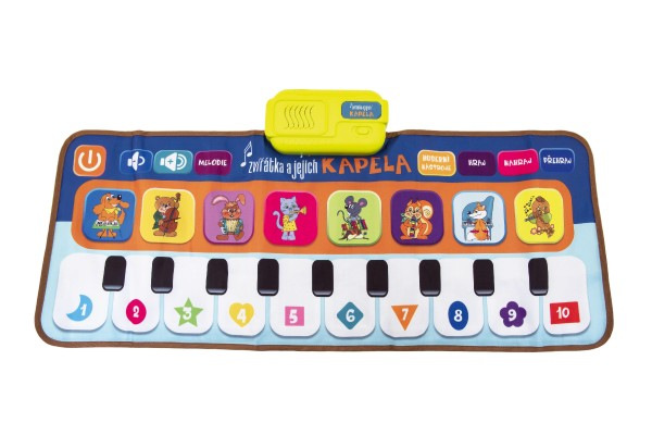 Interaktivní hrací podložka (dětské piano) z řady Zvířátka a jejich kapela je skvělou pomůckou, se kterou se děti pomocí 10 kláves učí poznávat zvuky pianka. Dále můžete naučit děti 6 lidových písniček pomocí přiloženého zpěvníku. Děti mohou hrát podle barev, tvarů nebo čísel. Obsahuje také 8 kláves s hudebními nástroji. Podložka rozvíjí zvědavost, logické myšlení, schopnost vnímat barvy, tvary a rytmus. Zlepšuje smysly, zrak, sluch a cit aktivním zapojením do hry, zdokonaluje jemnou motoriku. Je z měkkého omyvatelného materiálu, který se lehce udržuje. Veselé a barevné motivy zaujmou dětskou pozornost a jsou skvělou pomůckou pro učení i seznamování se s hudbou. Baterie 3x AA nejsou součástí balení. Velikost hrací podložky je 80 x 37 cm. Rozměry balení 38 x 18 x 5 cm Vhodné pro děti od 3 let