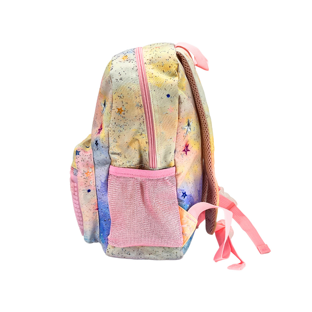 Batoh určený pro děti předškolního a nižšího školního věku vhodný pro každodenní používání. Batoh je vyrobený ze 100 % polyesteru a silikonu což umožňuje velice snadnou údržbu. Stačí jen jednoduše otřít vlhkým hadříkem nebo houbičkou. Batoh má hlavní kapsu s dostatkem místa pro nezbytnosti dětského světa a menší kapsu určenou pro drobnosti, které děti potřebují mít vždy po ruce. Obě kapsy jsou uzavíratelné na zipy, které jsou opatřeny velkými taháčky pro snadné otvírání a zavírání batohu. Po obou stranách batohu jsou síťovinové kapsy, vhodné např. pro umístění lahve, s praktickým elastickým páskem našitým v horním okraji. Pro komfortní užívání je batoh opatřen polstrovanými délkově nastavitelnými popruhy s hrudní přezkou a pevným úchytem pro snadné přenášení v ruce. Měkce polstrovaná zádová část zajišťuje komfortní užívání. V dolní části přední strany je umístěn jedinečný silikonový PIXIE CREW creative panel TM růžové barvy. Máte k dispozici máte prostor pro nekonečné množství motivů n