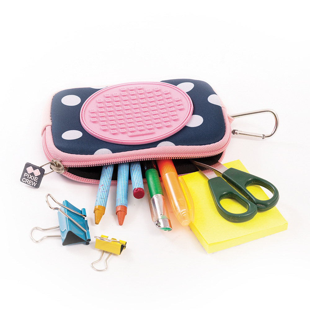 Víceúčelové velké pouzdro nejen na školní potřeby. Pouzdro je vyrobeno kombinací silikonu a trendové plsti, které chrání obsah pouzdra při nárazech a pádech. Pouzdro je v horní části uzavíratelné na zip. Uvnitř pouzdra je dostatek místa na pera, tužky a další školní potřeby nebo drobné věci, které potřebujete mít vždy po ruce. Přední stranu tvoří unikátní silikonový PIXIE CREW creative panel TM růžové barvy o velikosti 33 x 10 bodů. Máte tedy k dispozici 227 pozic pro nekonečné množství motivů na každý den díky PIXIES (pixelům), které můžete kdykoli sundat a vyměnit za jiné. Ke každému pouzdru zdarma přikládáme balíček přibližně 100 ks malých PIXIES a mini galerii pro inspiraci. Rozměr balení: 20,3x12x3,7cm. Věk: 6+