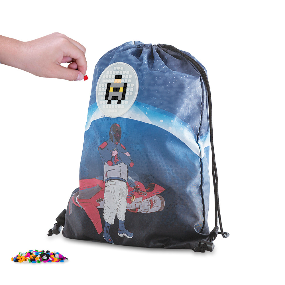 Praktický a univerzální vak na záda od PIXIE CREW s rakeťákem Derekem je ideálním doplňkem k aktovce nebo jako samostatný pomocník pro volnočasové aktivity. Jeho hlavní prostor uzavíratelný šňurkovými popruhy poskytuje dostatek místa pro uložení různých drobností, ať už jsou to sportovní potřeby, svačina nebo školní pomůcky. Vnitřní kapsa na drobnosti je praktická pro uchování menších předmětů jako jsou klíče nebo peníze. Praktický je také i díky použitému materiálu, který je jednoduchý na údržbu a je lehce složitelný a skladný. Sáček je lehký a snadno se nosí, a zároveň nabízí možnost personalizace pomocí pixelů, což umožňuje dětem vyjádřit svůj osobní styl. Na přední straně je umístěn unikátní silikonový PIXIE CREW creative panel TM svítící ve tmě. Kruh je o průměru 9 cm a k dispozici máte 86 bodů pro nekonečné množství motivů na každý den díky PIXIES (pixelům), které můžete kdykoli sundat a vyměnit za jiné. K vaku zdarma přikládáme balíček přibližně 55 ks malých PIXIES (pixelů), 10