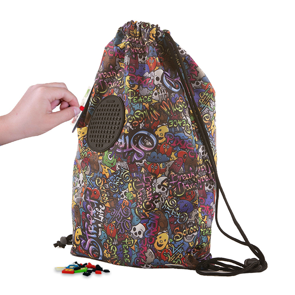 Praktický a univerzální vak na záda od PIXIE CREW v designu graffiti je ideálním doplňkem k aktovce nebo jako samostatný pomocník pro volnočasové aktivity. Jeho hlavní prostor uzavíratelný šňurkovými popruhy poskytuje dostatek místa pro uložení různých drobností, ať už jsou to sportovní potřeby, svačina nebo školní pomůcky. Vnitřní kapsa na drobnosti je praktická pro uchování menších předmětů jako jsou klíče nebo peníze. Praktický je také i díky použitému materiálu, který je jednoduchý na údržbu a je lehce složitelný a skladný. Sáček je lehký a snadno se nosí, a zároveň nabízí možnost personalizace pomocí pixelů, což umožňuje dětem vyjádřit svůj osobní styl. Na přední straně je umístěn unikátní silikonový PIXIE CREW creative panel TM černé barvy. Kruh je o průměru 9 cm a k dispozici máte 86 bodů pro nekonečné množství motivů na každý den díky PIXIES (pixelům), které můžete kdykoli sundat a vyměnit za jiné. K vaku zdarma přikládáme balíček přibližně 55 ks malých PIXIES (pixelů), 10 malý