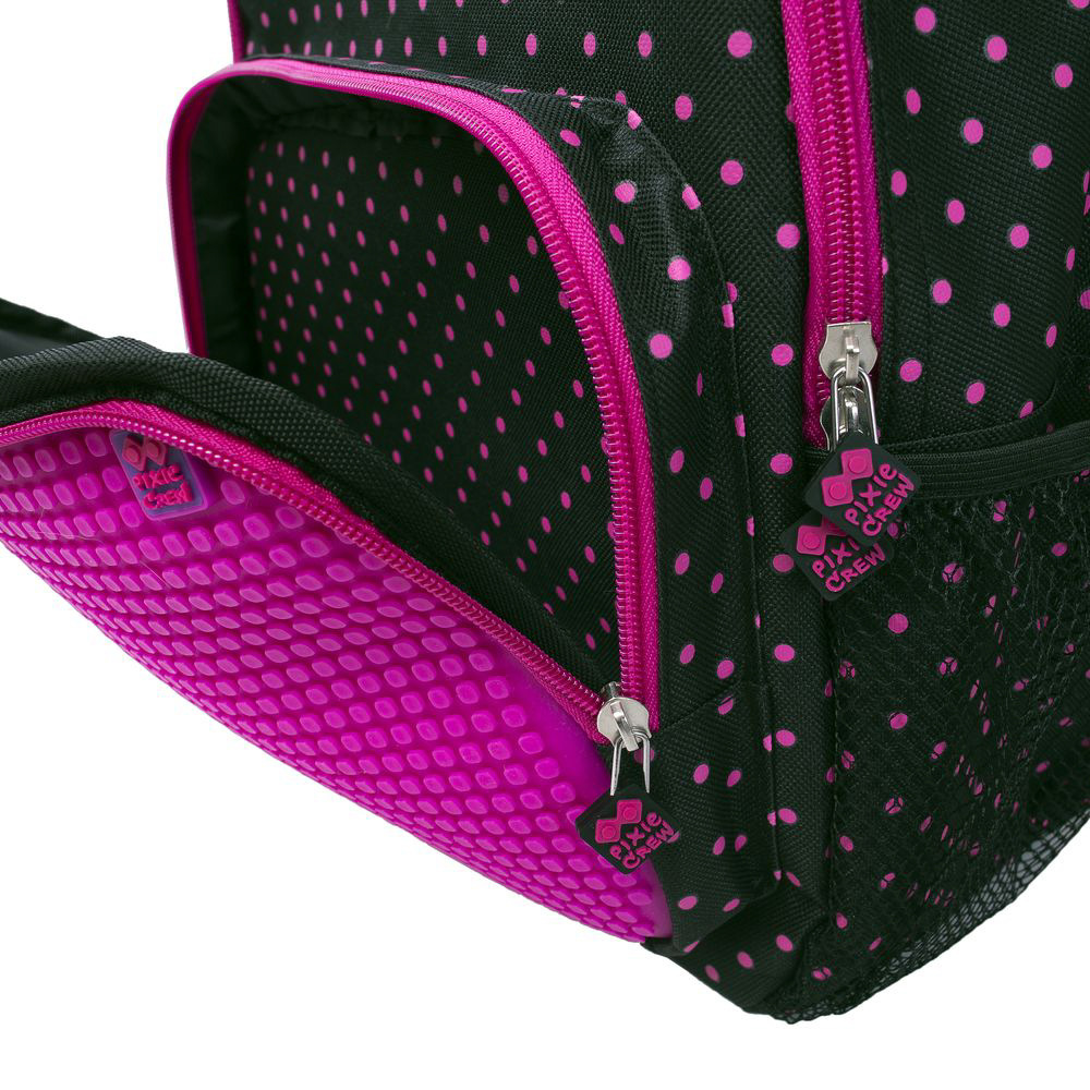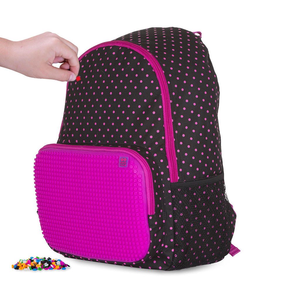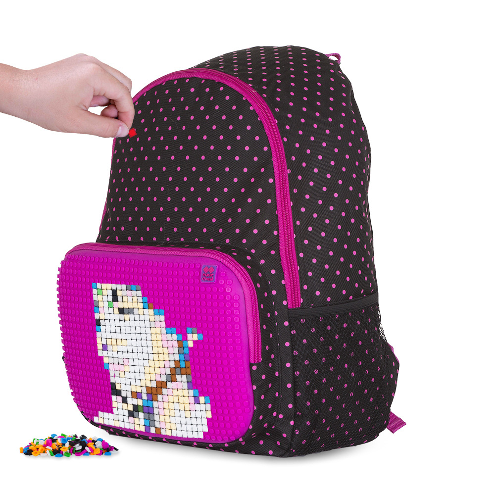 PIXIE CREW Jednokomorový Batoh s Přední Kapsou: "Tento praktický a elegantní jednokomorový batoh od PIXIE CREW je ideální pro každodenní nošení. Hlavní komora a přední kapsa jsou opatřeny zipy pro bezpečné uložení vašich věcí. Postranní síťované kapsy jsou perfektní pro uchování láhví s nápoji nebo jiných drobností. Batoh také nabízí pohodlný prošitý zádový systém, který zajišťuje komfort při nošení, a délka popruhů je nastavitelná, což umožňuje přizpůsobení pro různé výšky a postavy. Jeho jednoduchý, ale stylový design je ideální pro školní i volnočasové aktivity, a nabízí také možnost personalizace pomocí PIXIE CREW pixelů." Na přední straně batohu je našitá kapsa určená pro menší věci s jedinečným silikonovým PIXIE CREW creative panelem TM fuchsiové barvy o velikosti 39 x 25 bodů. Máte tedy 958 pozic pro nekonečné množství motivů na každý den díky PIXIES (pixelům), které můžete kdykoli sundat a vyměnit za jiné. Ke každému batohu zdarma přikládáme balíček přibližně 200 ks malých PIXI