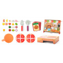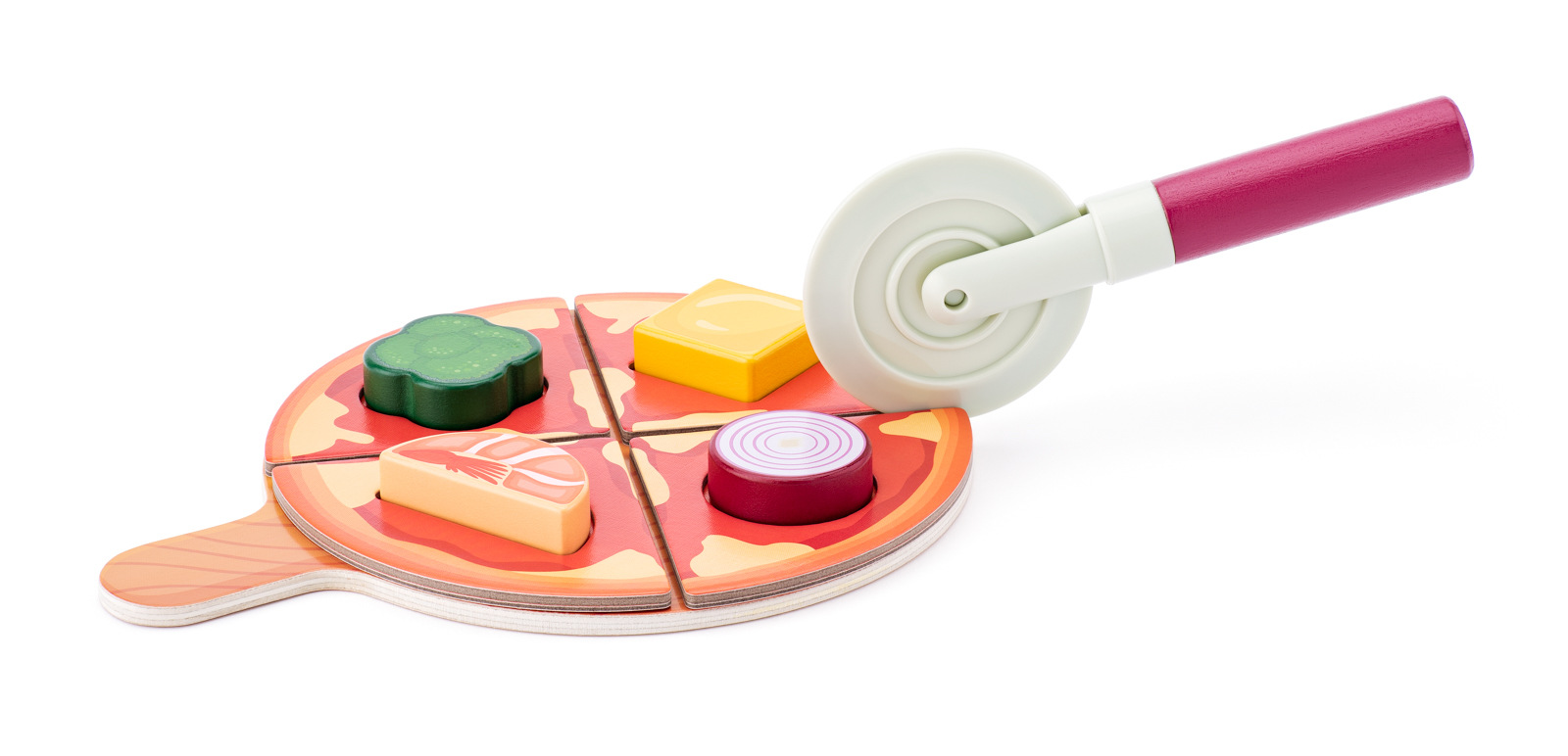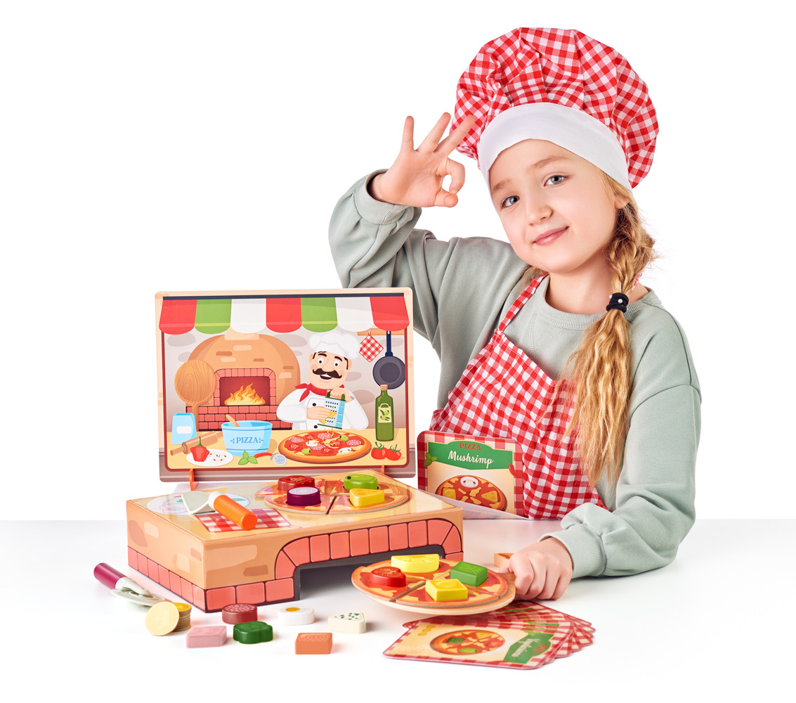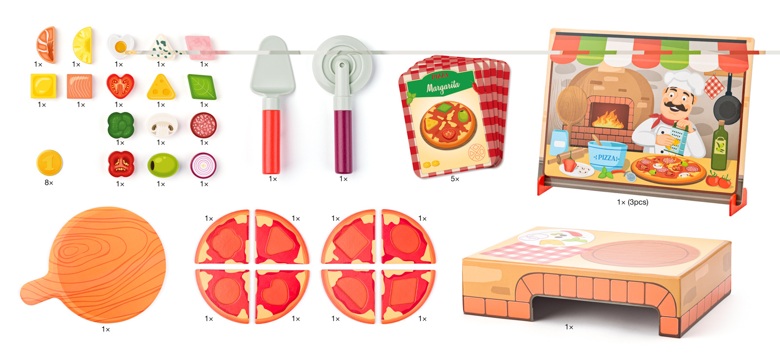 Tato hra je především o rozlišování tvarů. Naučná část je příjemně propojena s přípravou a "pojídáním" pizzy. Dítě má za úkol připravit pizzu dle obrázku vybrané karty za pomocí dílků s ingrediencemi. Dílky však musí přesně sedět. Tvarem i obsahem musí odpovídat vybrané kartě. Hotovou pizzu pak vloží do pece, upeče a pak už jen zbývá vyinkasovat přesný počet mincí, který je uveden na každé kartě. | Věk:2+ | Rozměr: 29,5x22x22cm. Průměr pizzy: 15 cm.