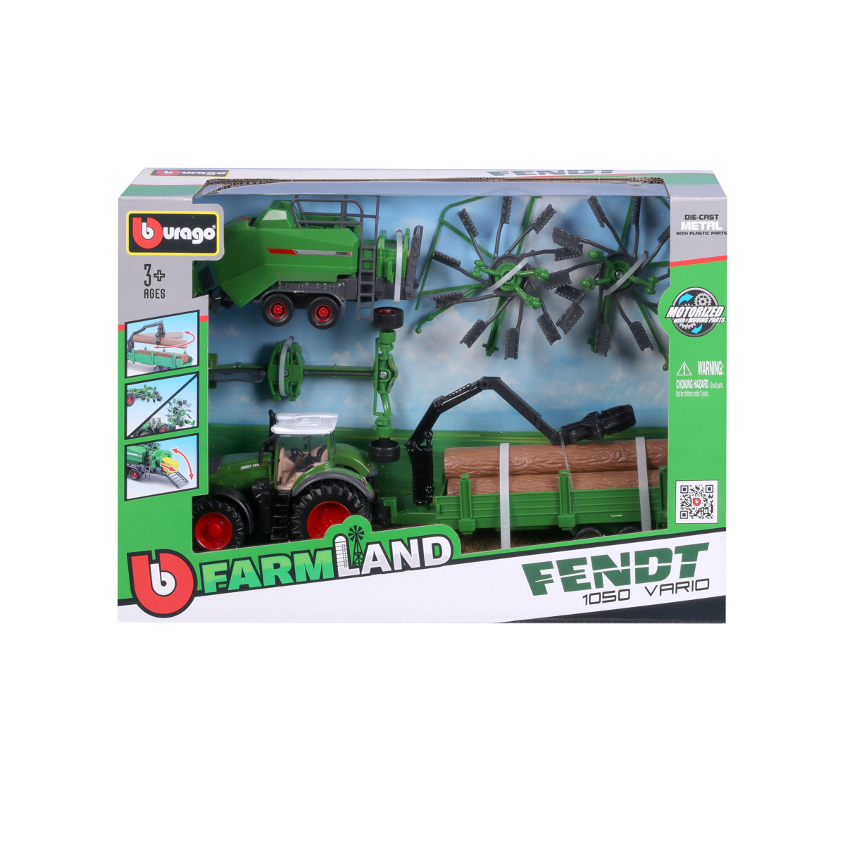 Modely traktorů se setrvačníkem v dárkové sadě s třemi přívěsy z kolekce Farmland jsou sbírkou modelů s vysokým důrazem na přesnost detailů. Modely o velikosti 10 cm jsou vyrobeny z litého kovu s plastovými detaily. Set FENDT 1050 VARIO obsahuje model traktoru, přívěs pro přepravu dřeva s nakladačem, přívěs s rotačními hráběmi a přívěs s balíkovačkou sena. Baleno v krabičce. Nevhodné pro děti do 3 let. Rozměry balení: 21,6 x 31,8 x 9,1 cm. Věk: 3+