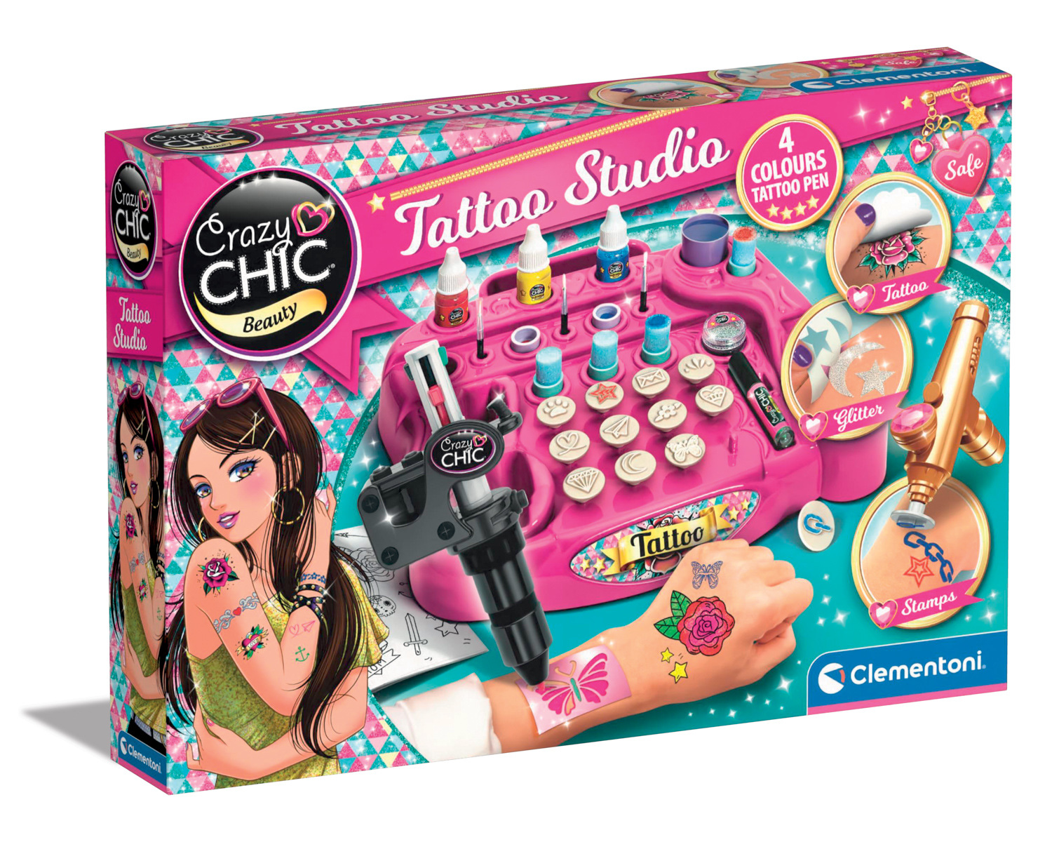 Mania tatuażu właśnie stała się super błyszcząca dzięki temu fantastycznemu zestawowi przenośnych tatuaży z brokatem. Mnóstwo błyszczących tatuaży, które nadadzą Twojemu stylowi szyku! Wszystko, co musisz zrobić, to wyciąć tatuaż, który ci się podoba, przycisnąć go do skóry, nałożyć gąbką i gotowe! Ta gra zachęca do kreatywności i pozwala dzieciom wyrazić siebie za pomocą tatuaży i stworzyć oryginalny wygląd na każdą okazję! Rozmiar opakowania: 14,5 x 18,5 x 0,2 cm Wiek: 6+