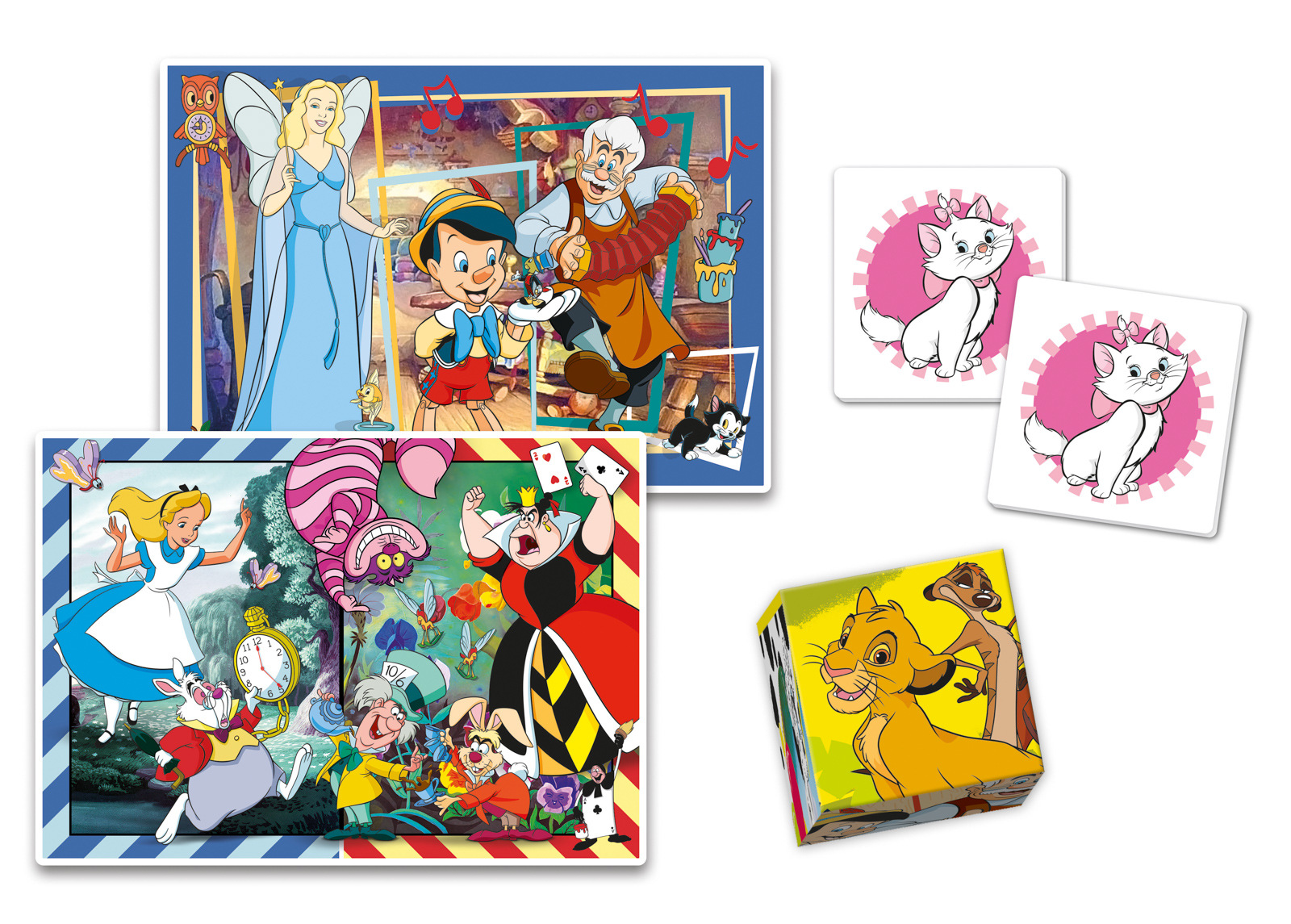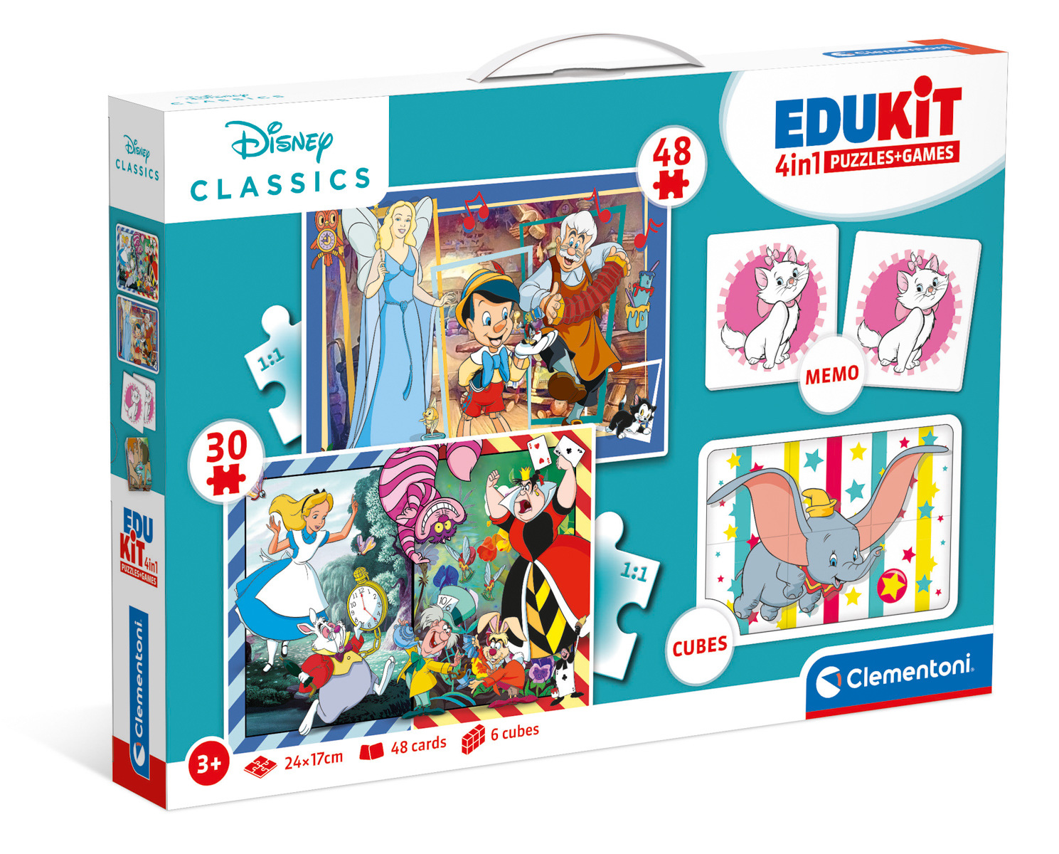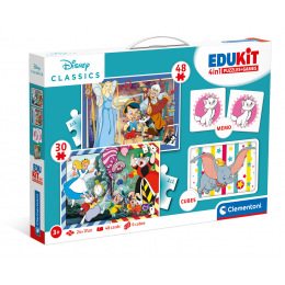 Zestaw 4 w 1 z postaciami Disneya od Clementoni. Zawiera puzzle składające się z 30 i 48 elementów, 6 kostek płatniczych i grę pamięciową. Puzzle mają ten sam rozmiar, 24 x 17 cm, ale inną liczbę elementów, więc im większa liczba elementów, tym mniejszy jest ich rozmiar. Zapakowane w tekturowe pudełko z plastikowym uchwytem ułatwiającym przenoszenie. Rozwija pamięć, umiejętności logiczne i sprawność manualną. Wymiary opakowania: 37x26x4,6 cm. Wiek 3+