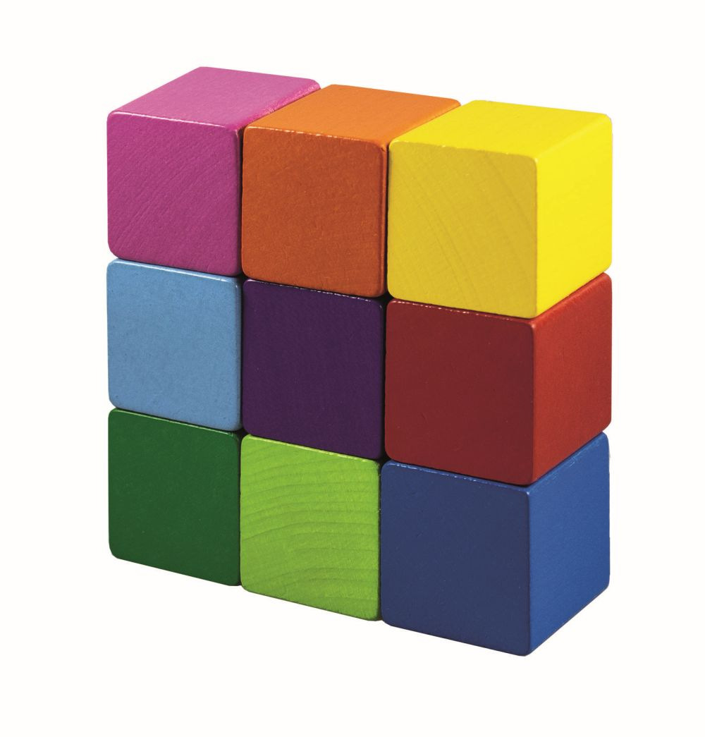 Duże drewniane kolorowe kostki o rozmiarze 35 mm.\Opakowanie zawiera 9 różnokolorowych klocków.\Produkt spełnia wymogi UE dotyczące bezpieczeństwa zabawek i jest odpowiedni dla dzieci od 1 roku życia.