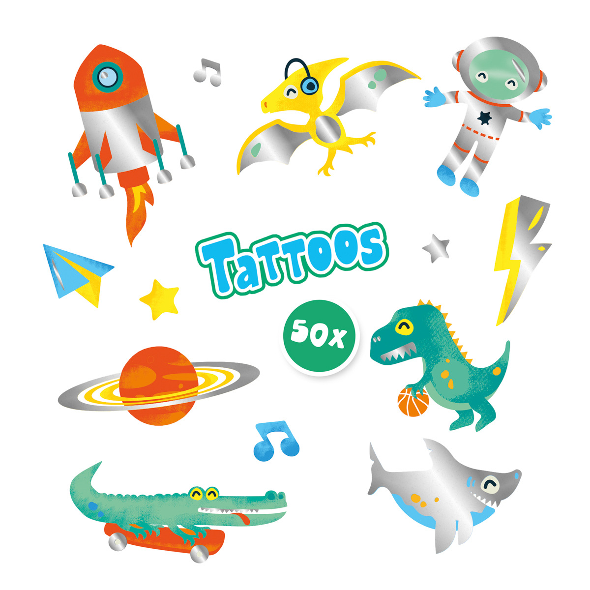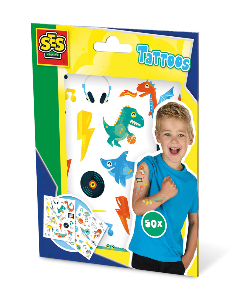 Zostań najfajniejszym facetem w mieście z zabawnym, metalicznym tatuażem SES. Tatuaż jest przyjemny, bezpieczny dla skóry i można go łatwo usunąć. Zawiera: 50 obrazów tatuaży. Wiek: 3+. Rozmiar opakowania: 15 x 20 x 0,5 cm.