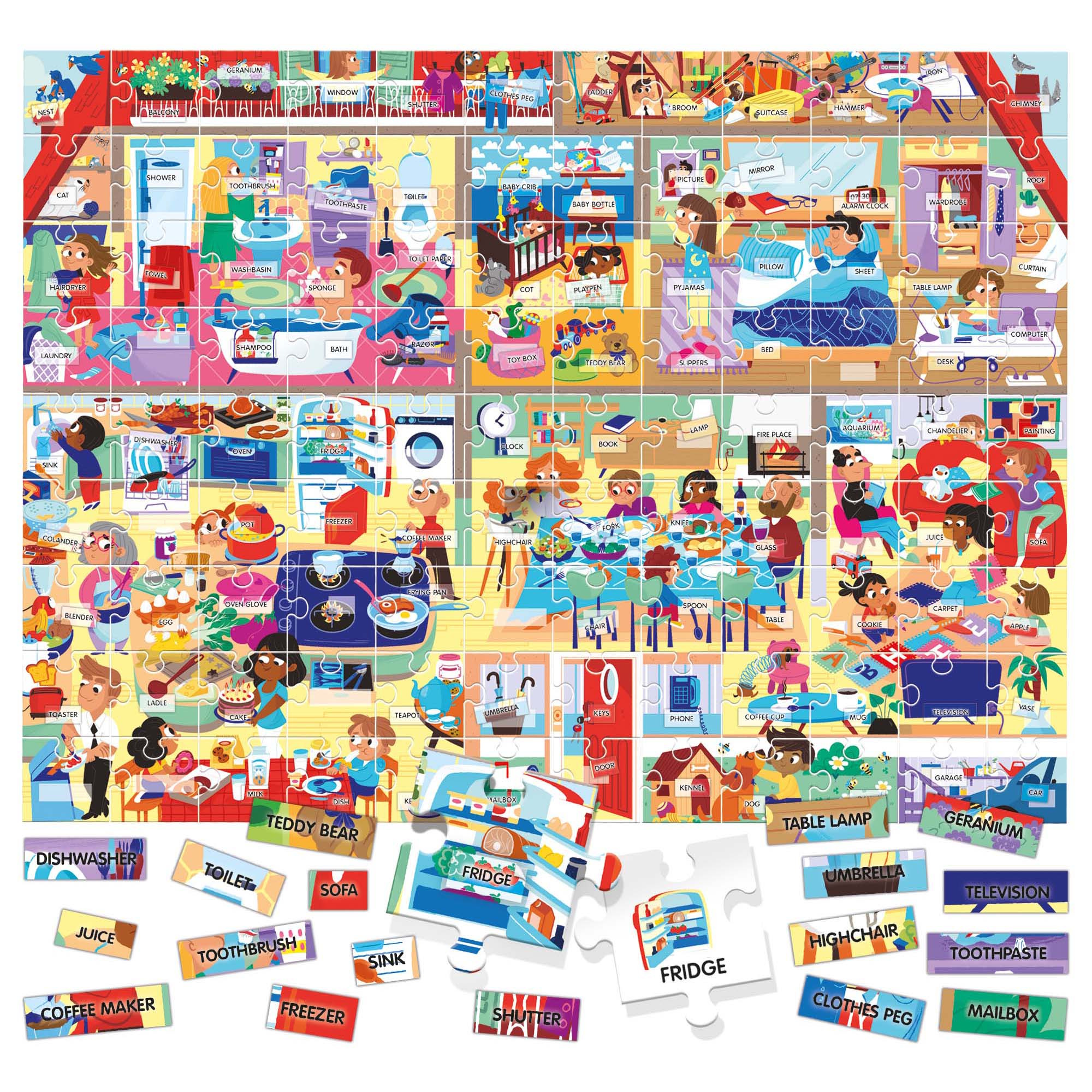 Velké puzzle se speciálními dílky pro výuku angličtiny už pro malé děti. Tato sada, vyrobená z odolných materiálů, obsahuje obří puzzle a více než 100 samolepek, které mohou být nalepeny a opět sejmuty. To vše podporuje učení se spousty slov spojených s domem plným barev. Správná výslovnost je podpořena speciálně vytvořenou aplikací.