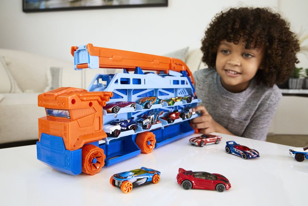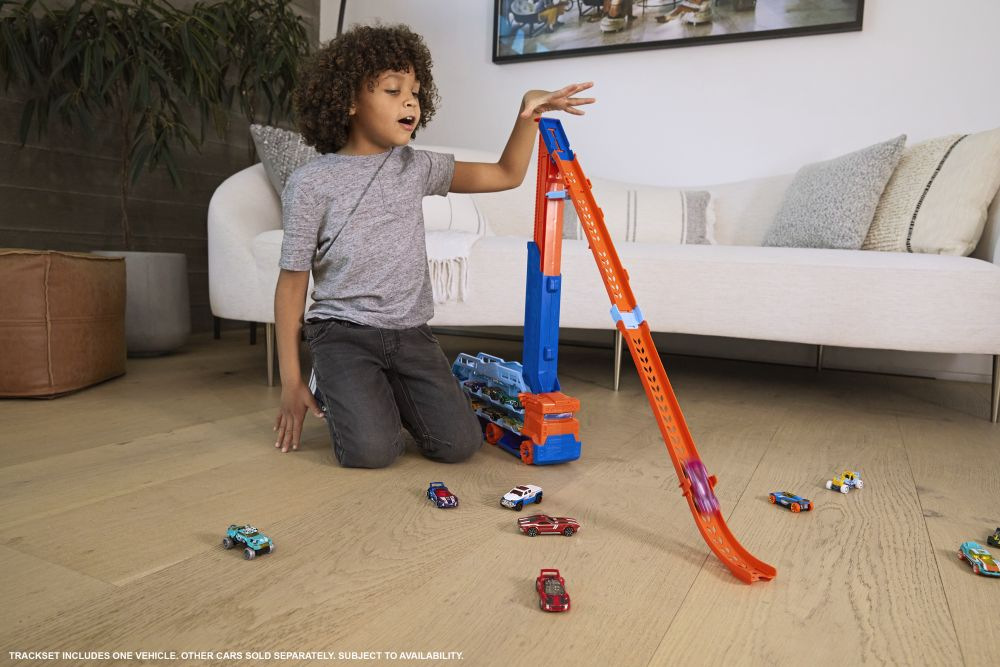 Hot Wheels™ Ciężarówka z wysokim torem łączy świetnie wyglądającą ciężarówkę Hot Wheels® z niesamowitym dwumetrowym pionowym torem wyścigowym, który można połączyć z innymi zestawami (sprzedawane oddzielnie). W trybie transportowym duży ciągnik może pomieścić ponad 20 resoraków w skali 1:64. Częścią zestawu jest jeden samochodzik Hot Wheels®.