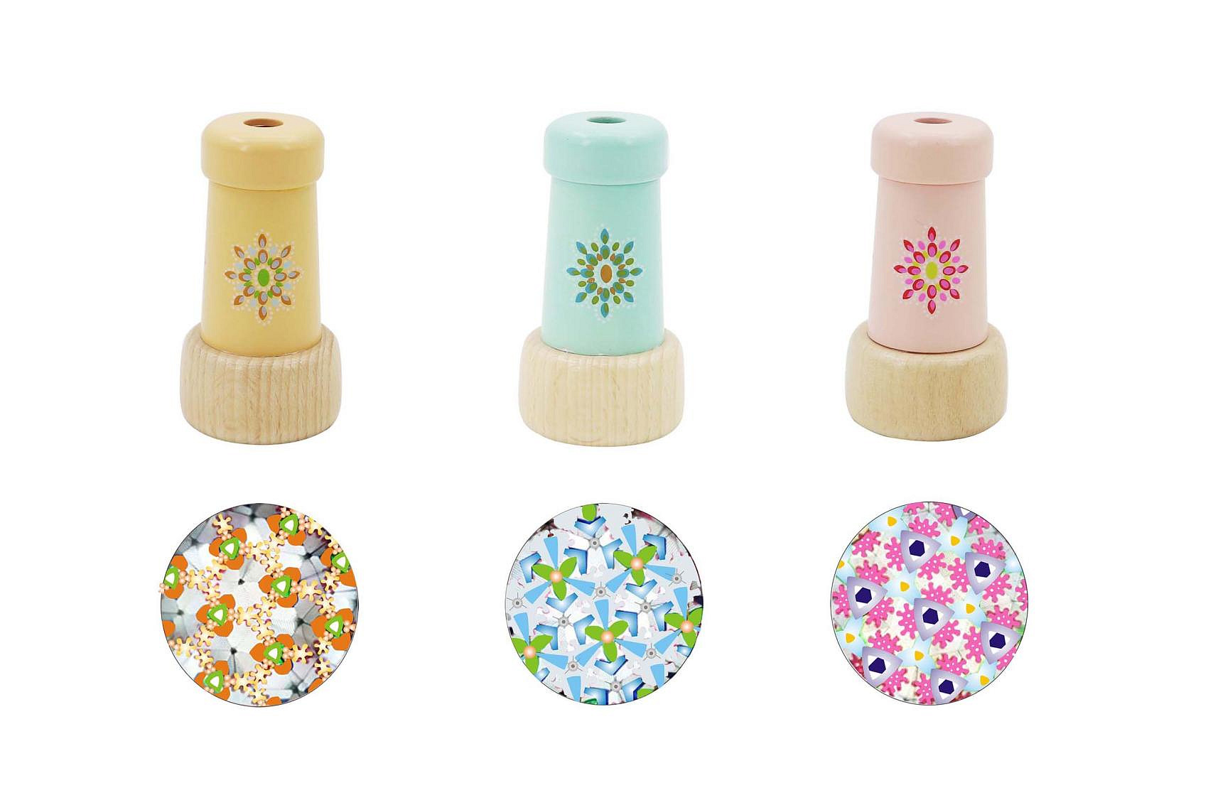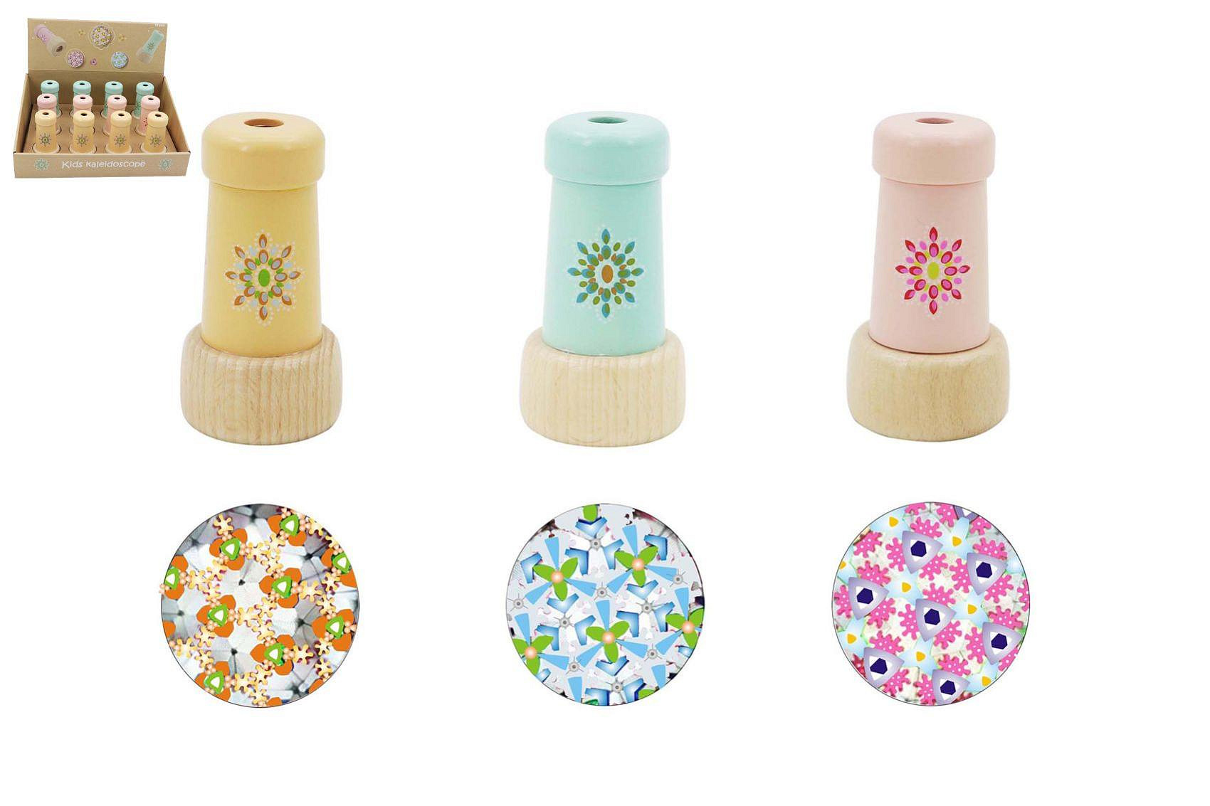 Kaleidoskop dřevěný. Rozměry 4,5x4,5x8,3 cm. 12 ks display box. 3 varianty - modrý, žlutý, růžový.