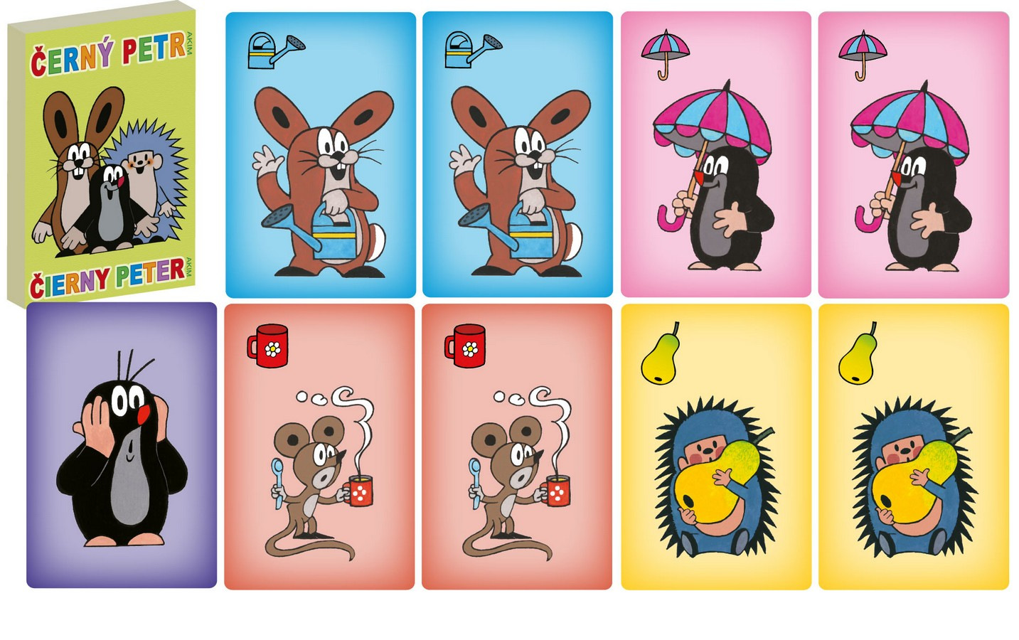 Karty dla dzieci do gry Czarny Piotruś z obrazkami Krecika autorstwa ilustratora Zdeněka Milera. Pudełko zawiera szczegółowe instrukcje, a karty mają lekko chropowatą powierzchnię na odwrocie dla lepszej obsługi.