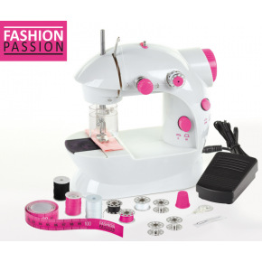 Funkcjonalna maszyna do szycia. Zestaw zawiera: maszynę do szycia, pedał nożny, 6 metalowych szpulek, zapasową igłę, nawlekacz nici. Plastikowa osłona igły chroniąca przed obrażeniami.