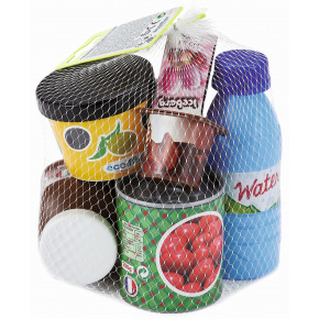 Zestaw żywności w siatce zawiera 8 modeli żywności. 2 jogurty, butelka wody, 2 puszki warzyw, krem c