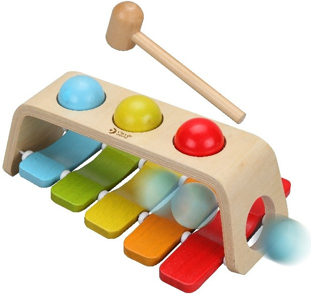 Xylofon, vkládačka a zatloukačka jsou propojené hračky, které nabízejí dětem možnost objevovat rytmu