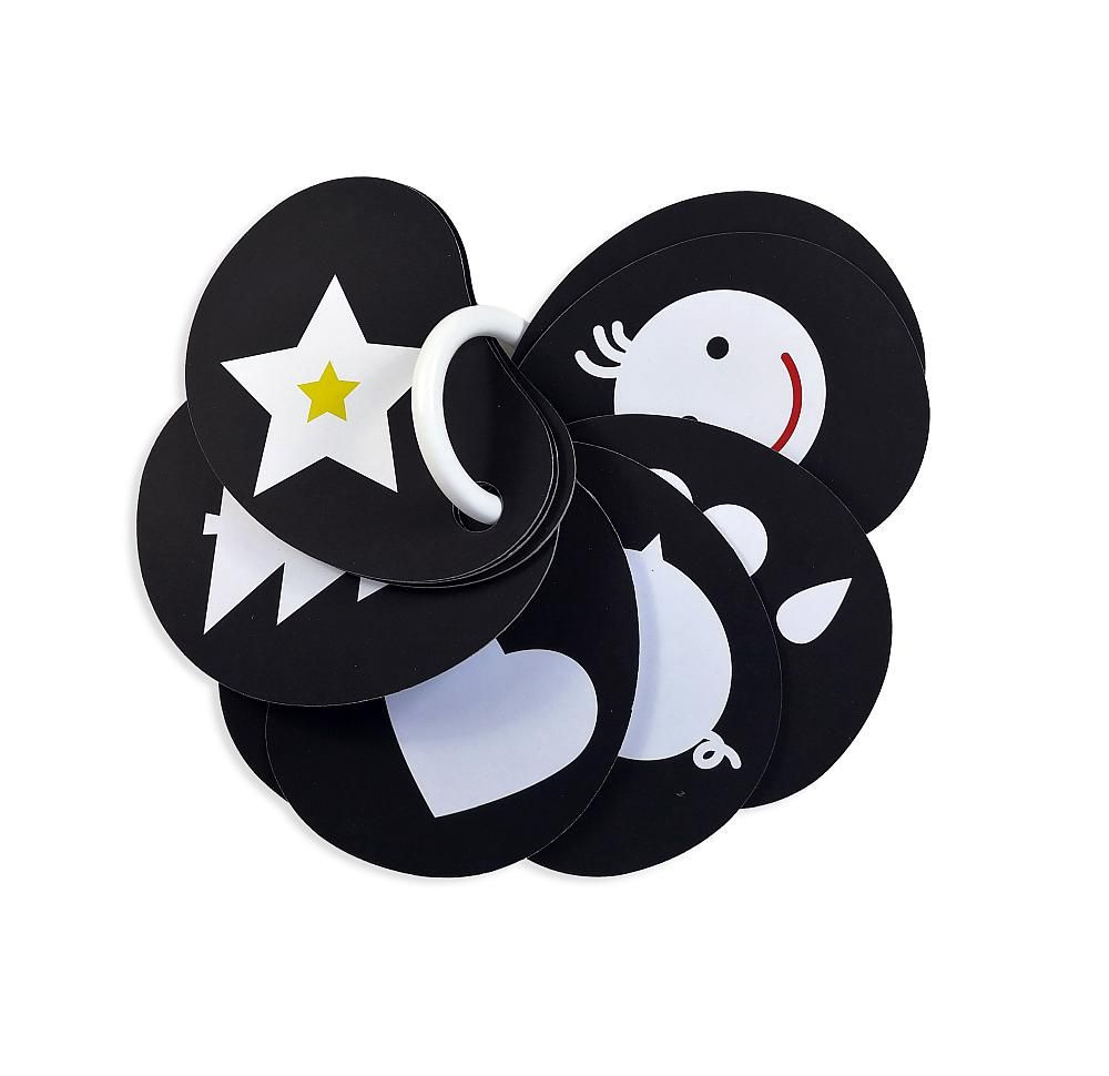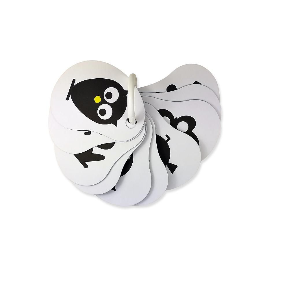 Kontrasty są odpowiednie dla niemowląt od 3 miesiąca życia, kiedy koncentrują wzrok na konturach, ostrych krawędziach i zaczynają używać zmysłu dotyku. Dlatego karty mają różne kształty i układy kolorów, co stanowi pierwsze wprowadzenie do kształtów i konturów.czytaj więcej