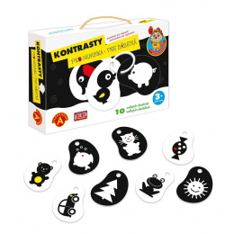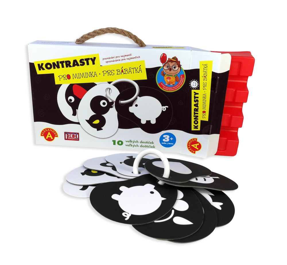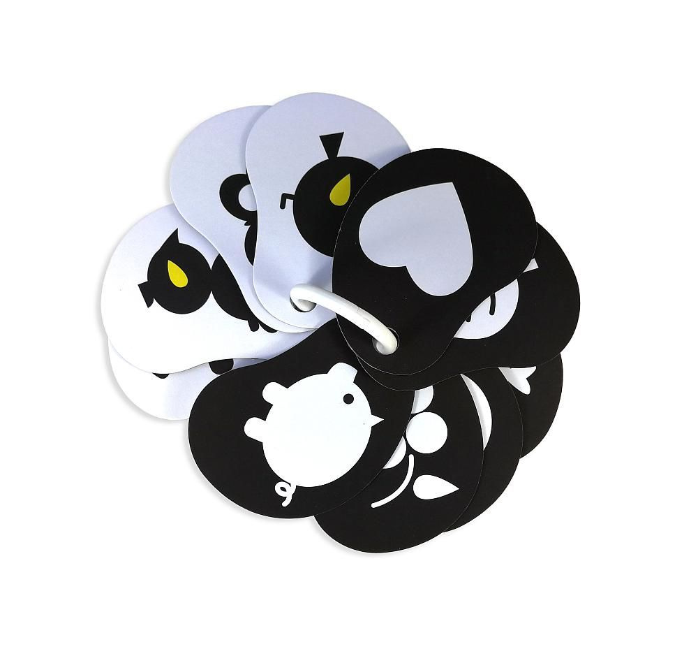 Kontrasty są odpowiednie dla niemowląt od 3 miesiąca życia, kiedy koncentrują wzrok na konturach, ostrych krawędziach i zaczynają używać zmysłu dotyku. Dlatego karty mają różne kształty i układy kolorów, co stanowi pierwsze wprowadzenie do kształtów i konturów.