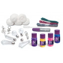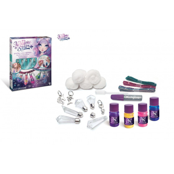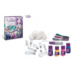 Náhrdelník přání. Vyrob si náhrdelník použitím pomůcek obsažených ve výrobku. 5 ks přívěsků ve tvaru krystalu, 5x bavlněná vatička, 3 třpytivé stuhy, 1x tuba s třpytivým práškem, 4 druhy inkoustů, 3x přívěsek, plastová pipeta.