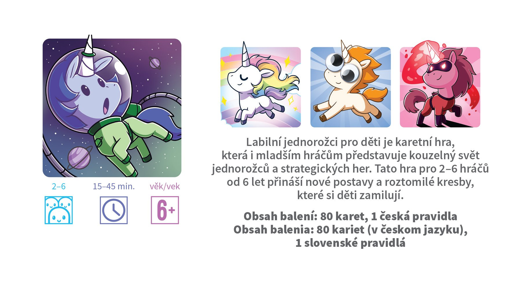 Labilní jednorožci pro děti je karetní hra, která i mladším hráčům představuje kouzelný svět jednorožců a strategických her. Tato hra pro 2-6 hráčů od 6 let přináší kouzelné postavy a roztomilé kresby, které si děti zamilují.